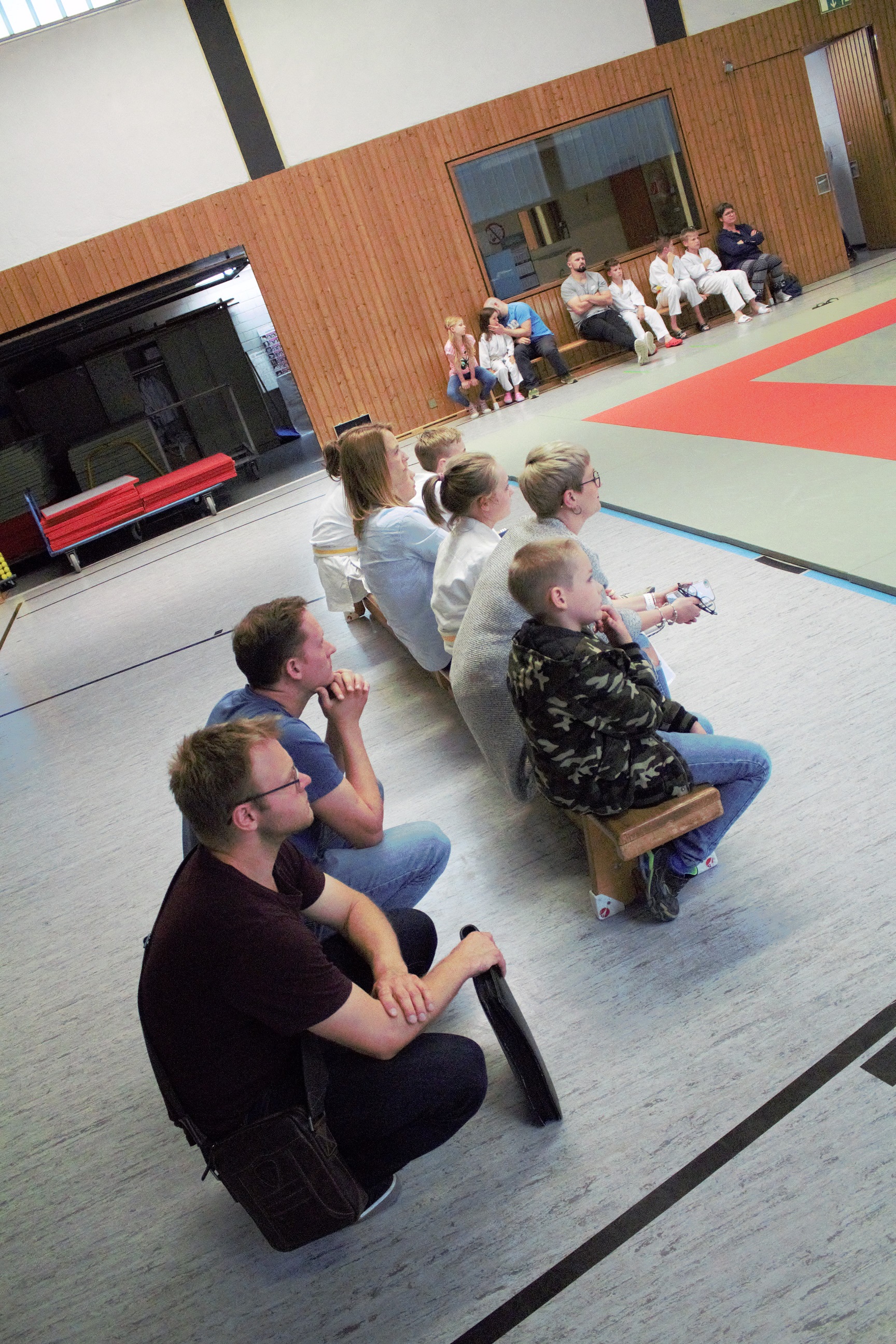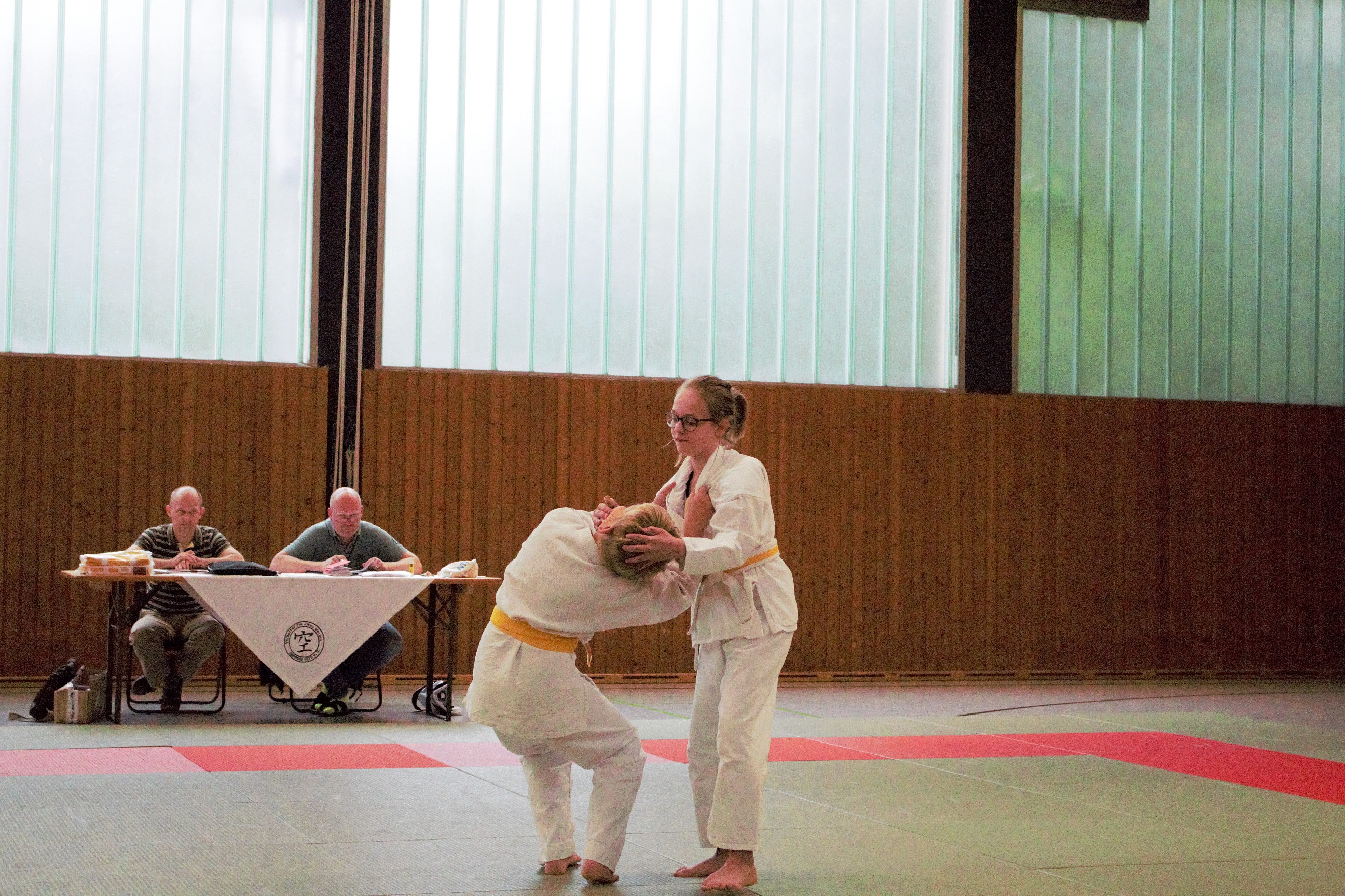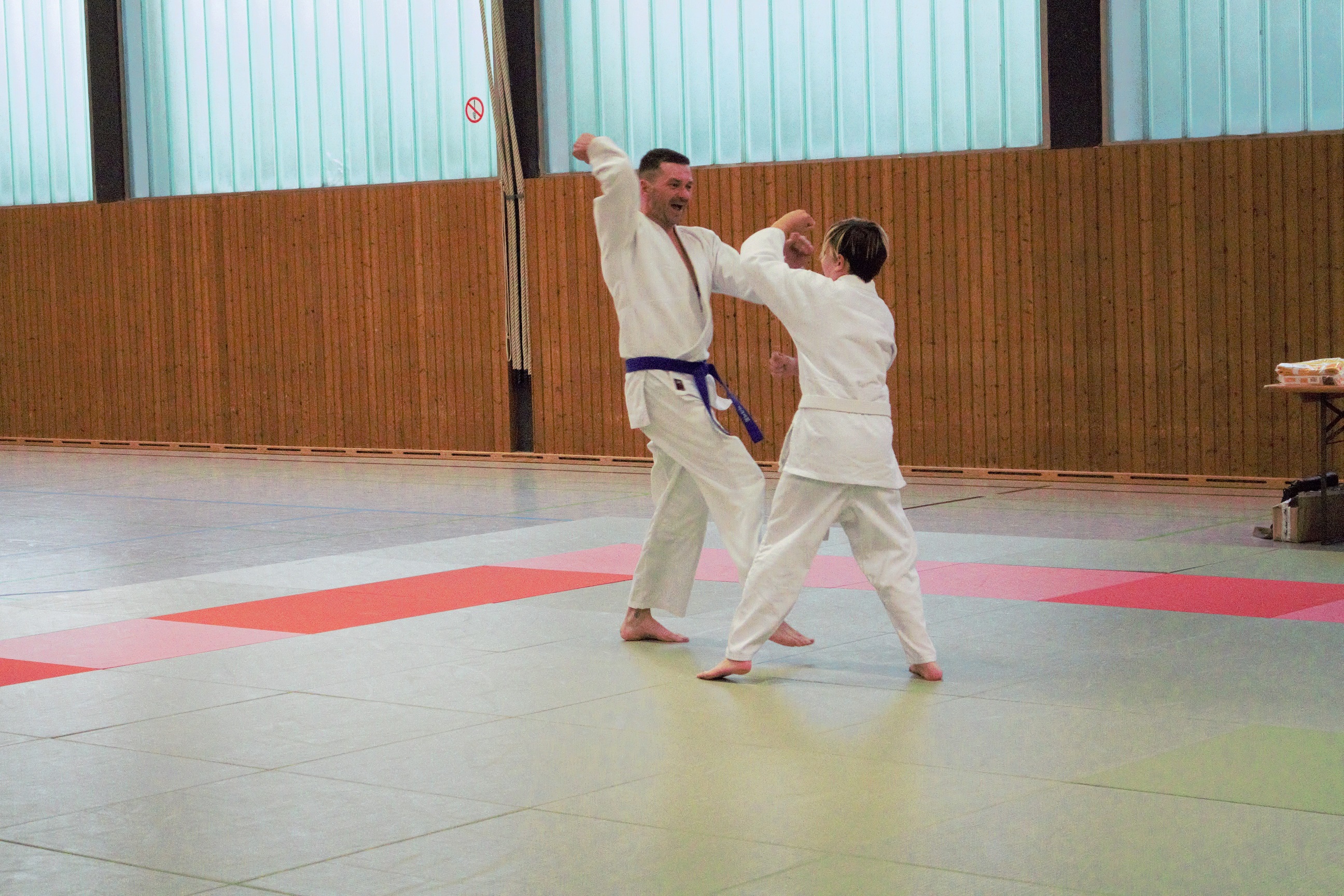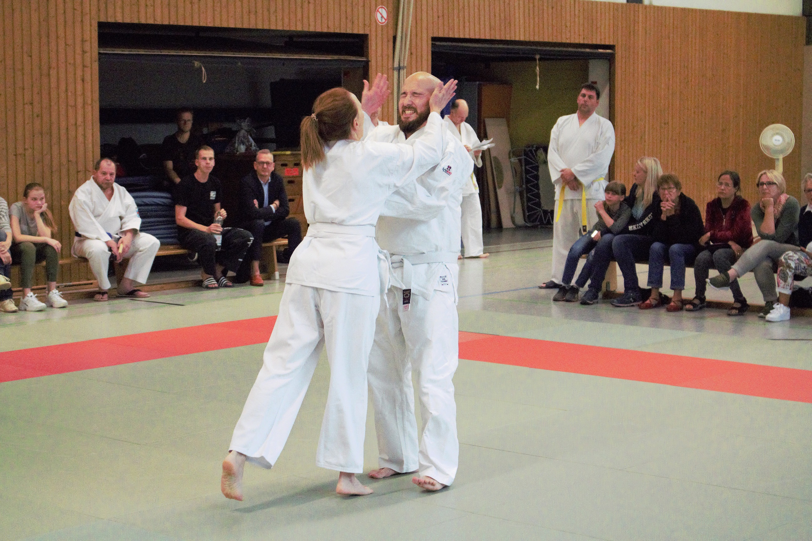 Wie immer begannen die Jiu-Kids mit ihren Vorführungen und ernteten sieben mal einen verdienten Applaus. Zwei der Kids hatten eine besondere Herausforderung. Da ihre Partner kurzfristig ausgefallen waren, sprangen Jugendtrainer Adam und Erwachsenentrainerin Andrea bereitwillig ein.
