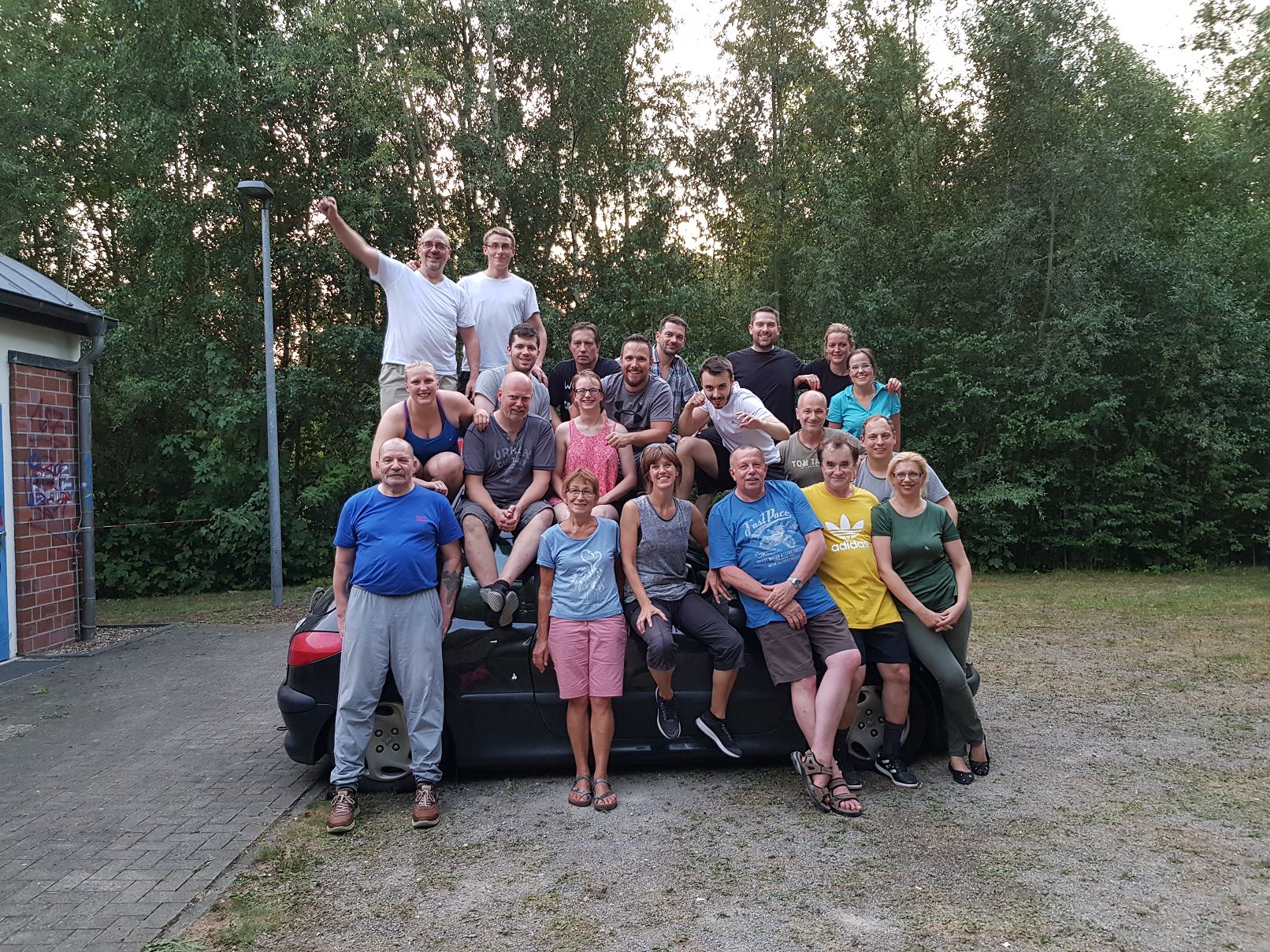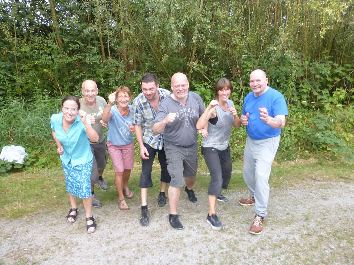 Die Einladungen von Uwe Reichert, dem „Macher“ des Zen-Ki-Budo, sind mitunter außergewöhnlich - aber gefreut haben wir uns trotzdem. Dass der 25. Juli einer der heißesten Tage seit langem werden sollte, konnte ja niemand ahnen, doch abends zwischen Bäumen und Wasserflächen war es ganz angenehm. Als wir bei Uwe ankamen waren schon einige seiner Sportler vor Ort. Auch ein paar „Nippons“ waren bereits angekommen und bald konnten wir mit einer für die Temperaturen beeindruckend großen Gruppe starten.