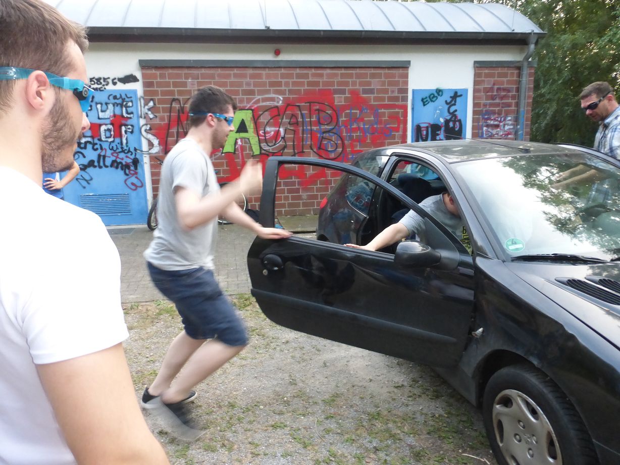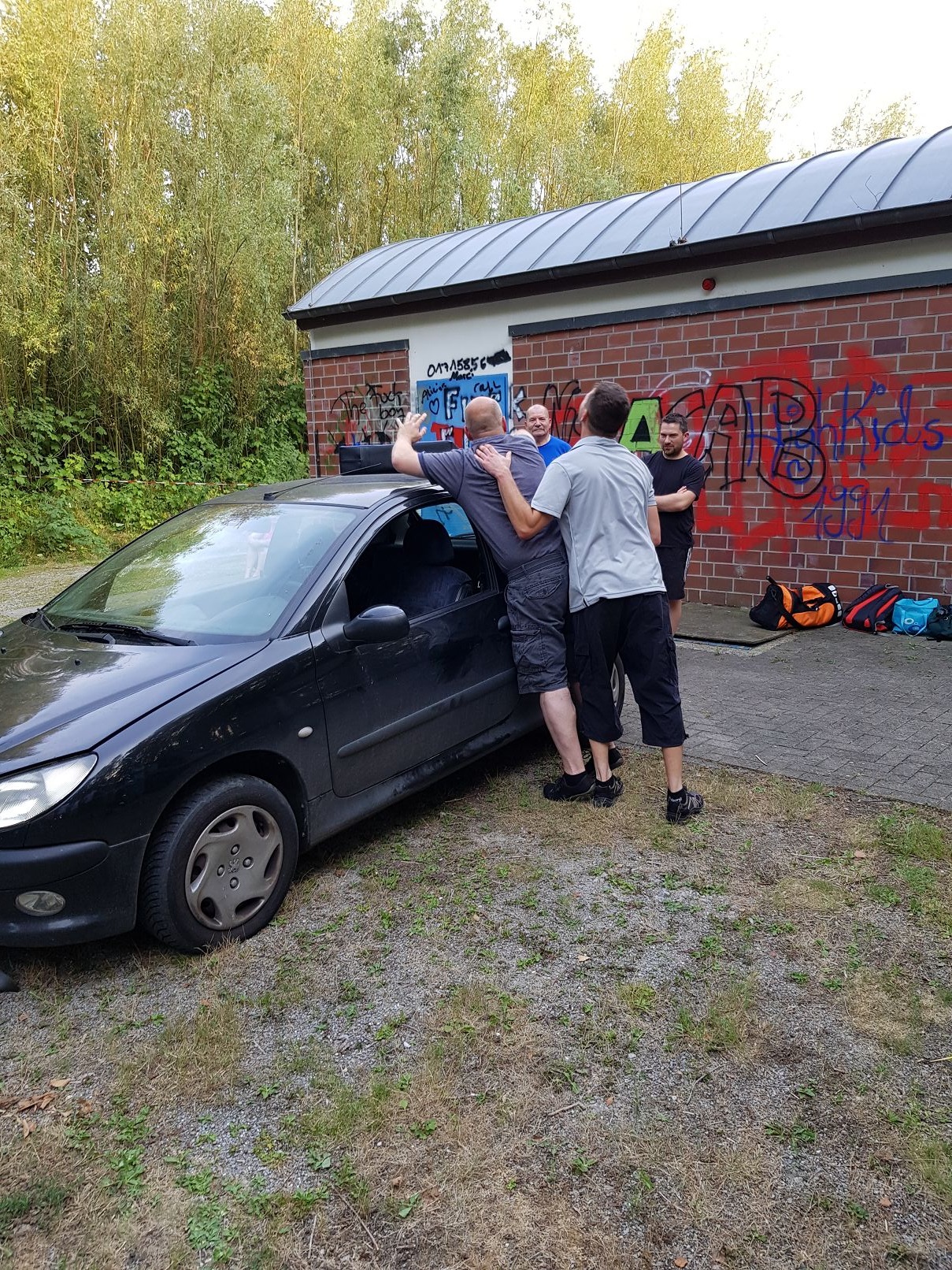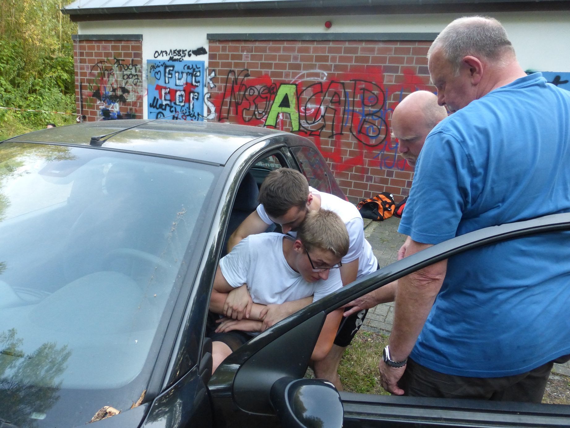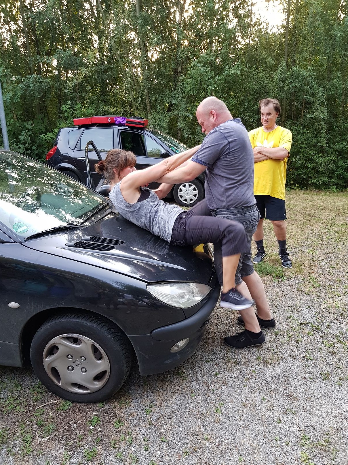 Ich hatte mir lange Gedanken gemacht, wie wir an diesem Abend den ersten Kontakt zum Auto herstellen könnten. Irgendwann war mir eine kleine Erste-Hilfe-Übung aus meiner Zeit des Zivildienstes eingefallen. Noch kurz hatte ich mit einem aktiven Feuermann abgeklärt, ob meine Idee auch heute noch so gelehrt wird - dann stand der Start fest. Die Evakuierung eines Bewusstlosen zu zweit vom Fahrersitz. Sofort war das Eis gebrochen - oder sagt man bei knapp 40 Grad besser geschmolzen? - und wir konnten mit den Selbstverteidigungstechniken am PKW beginnen.