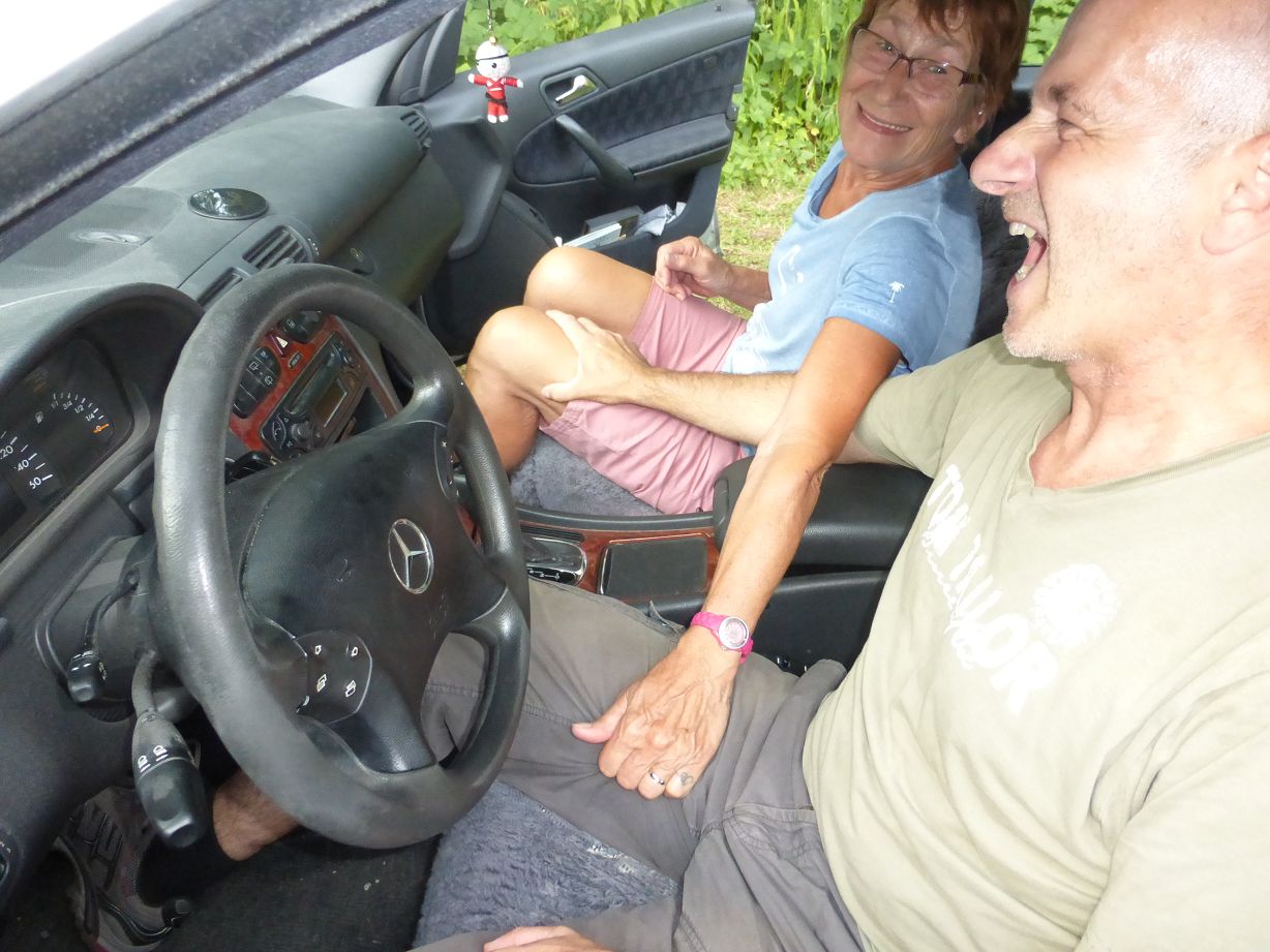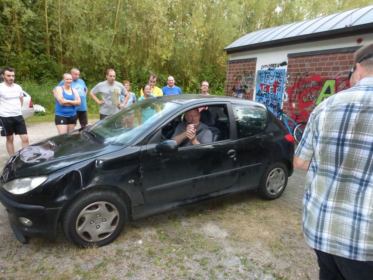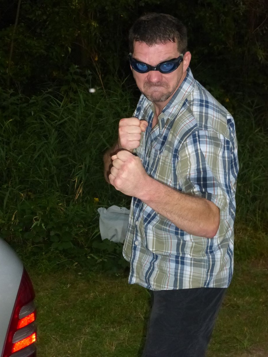 Der Angriff durchs Fahrerfenster, der Griff durchs Beifahrerfenster um etwas zu stehlen, der Anhalter, der vom Beifahrersitz aus angreift, Gewalt beim Auto aufschließen, oder, oder ,oder… Alle diese Angriffe galt es mit schnellen, einfachen Techniken - teilweise mit der Autoausstattung als Waffe - abzuwehren. Gerade die Übungen im Wageninnenraum waren für die meisten sehr gewöhnungsbedürftig, da man sich auf Fahrer- oder Beifahrersitz nur sehr wenig bewegen kann. Aber Möglichkeiten gibt es überall. Als kleines Highlight hatte ich Pfefferspray-Übungssprays besorgt, um aus dem Auto heraus einen Angreifer in die Flucht zu schlagen. Diese Kartuschen enthalten zwar keinen Reizstoff, sondern in erster Linie Wasser, aber auch - damit die Füllung nicht anfängt zu stinken - ein Desinfektionsmittel. Um den Angreifern gerötete Augen zu ersparen, versahen wir sie mit Chlorbrillen. Fast zwei Stunden tobten wir auf Uwes Parkplatz, bis wir völlig verschwitzt und der Schrottwagen endgültig fertig waren. Da kam die Einladung auf ein kühles Getränk in Uwes Garten gerade recht, und wir konnten mit netten Gesprächen den Abend ausklingen lassen.
