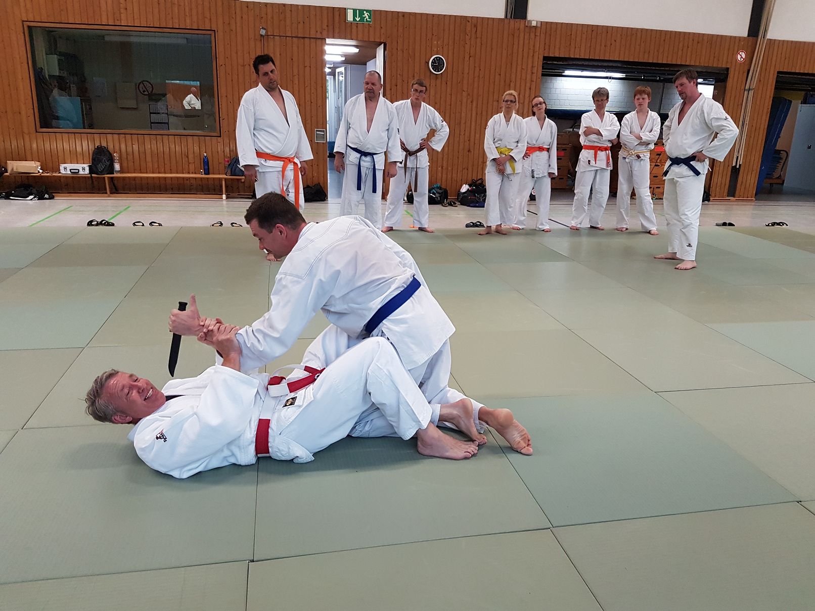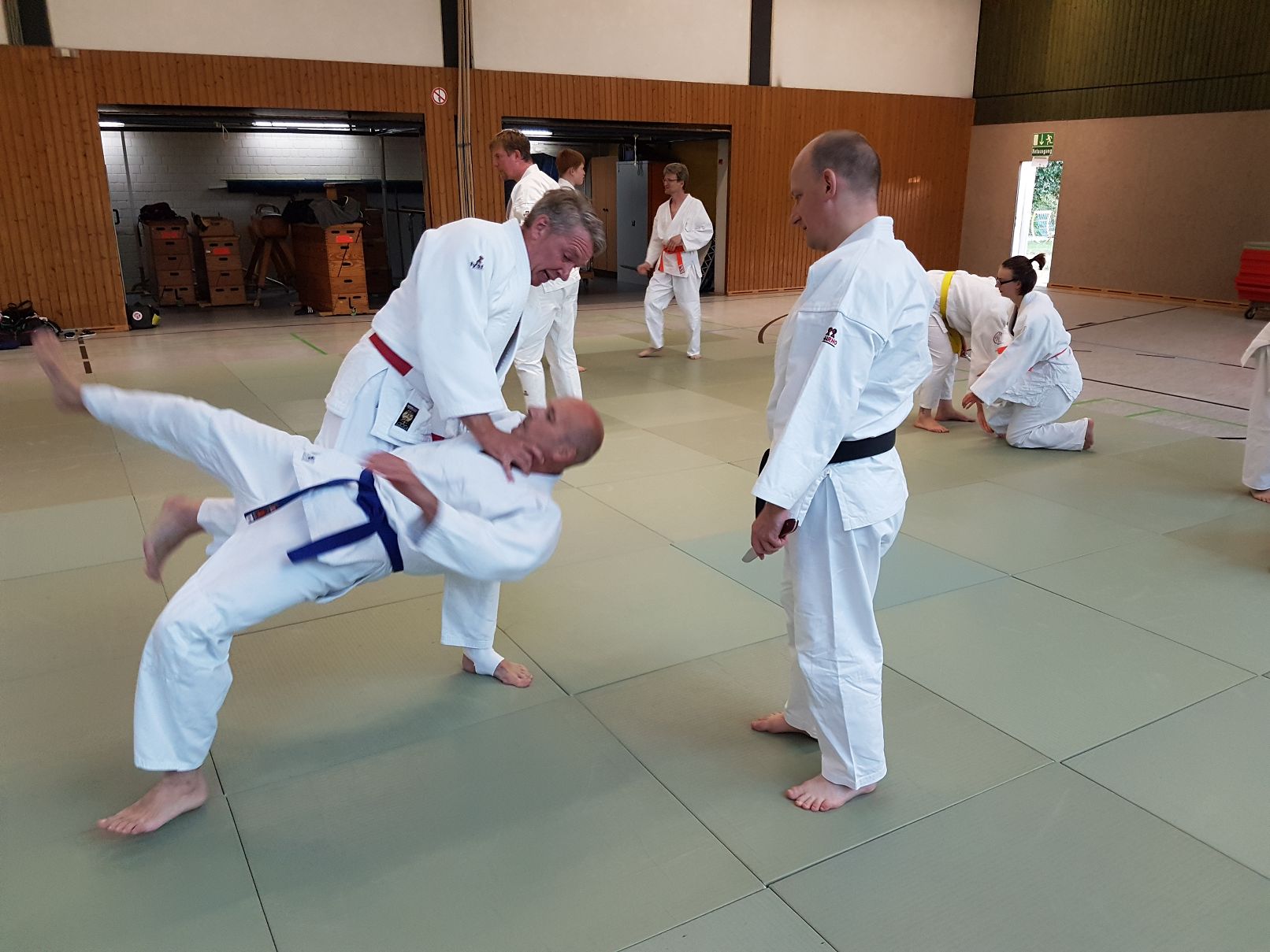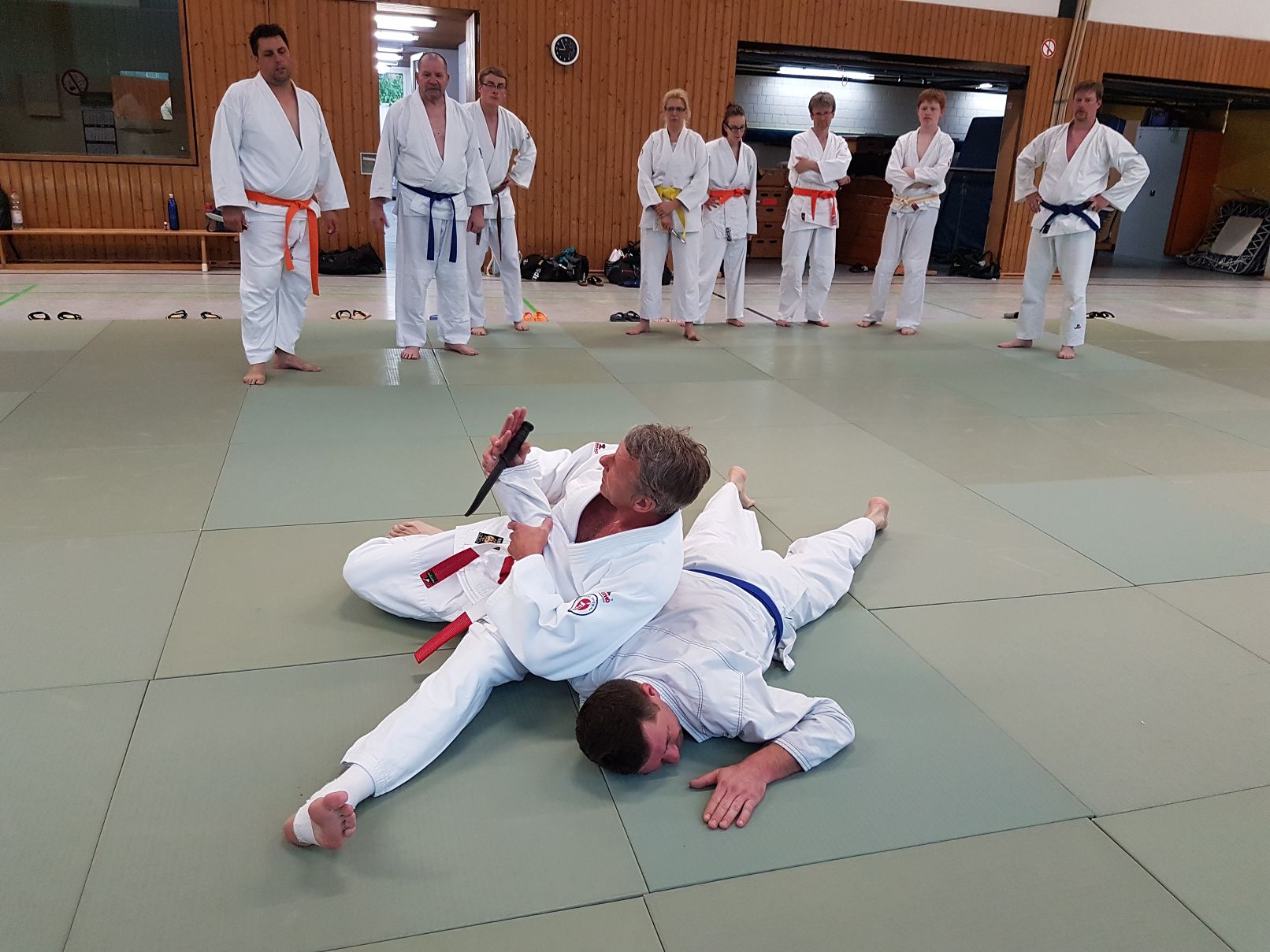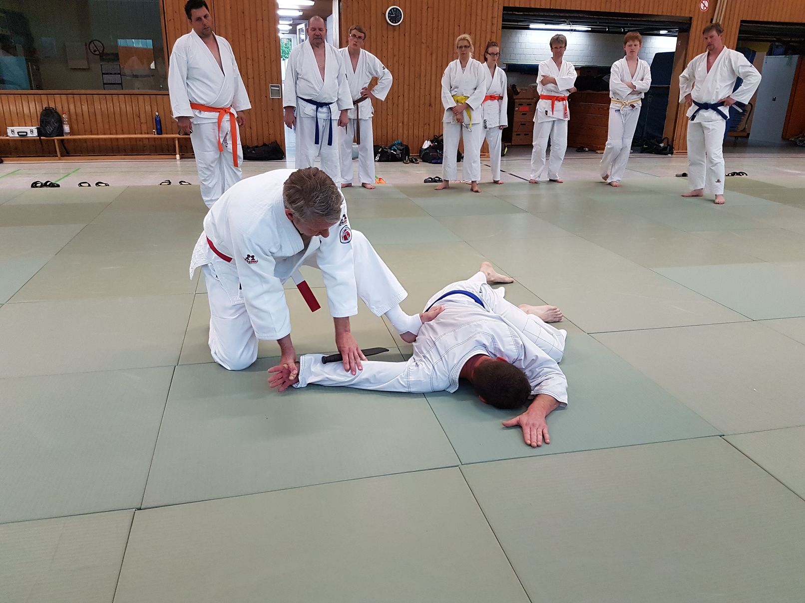 Der Applaus nach dem Training war seiner! Die Begeisterung der Sportler kam von ganzen Herzen. Dieter Gobien, 6. Dan Jiu Jitsu, Prüfungswart der JJU NW, hatte am 29. Juli bei uns ein Gasttraining gegeben. Wie bei vielen Sondertrainingseinheiten, hatten wir die Sportler des Zen-Ki-Budo aus Bochum eingeladen. Diese Vereinsfreundschaft besteht bereits seit längerer Zeit und so trainieren die Nippons und die Zen-Ki-Budos immer mal wieder zusammen. „Habt Ihr einen besonderen Wunsch für das Thema?“ hatte Dieter im Vorfeld gefragt. Spontan war uns „Abwehren von Messerangriffen“ in den Sinn gekommen. Dass dies eine gute Wahl war, merkten wir ganz schnell. Nach einem kurzen Aufwärmtraining mit Jiu Jitsu-Bewegungen und Technikeingängen, legte Dieter los. Es gab eine kurze Theorie über das Messer als Waffe und schon hatte Dieter diese Waffe bedrohend am Hals. Doch schneller als Angreifer Adam schauen konnte, lagen die Dinge völlig anders - nämlich Adam auf dem Boden und das Messer ganz ruhig in Dieters Hand. Dann wurde geübt…