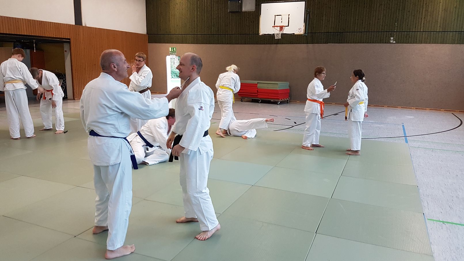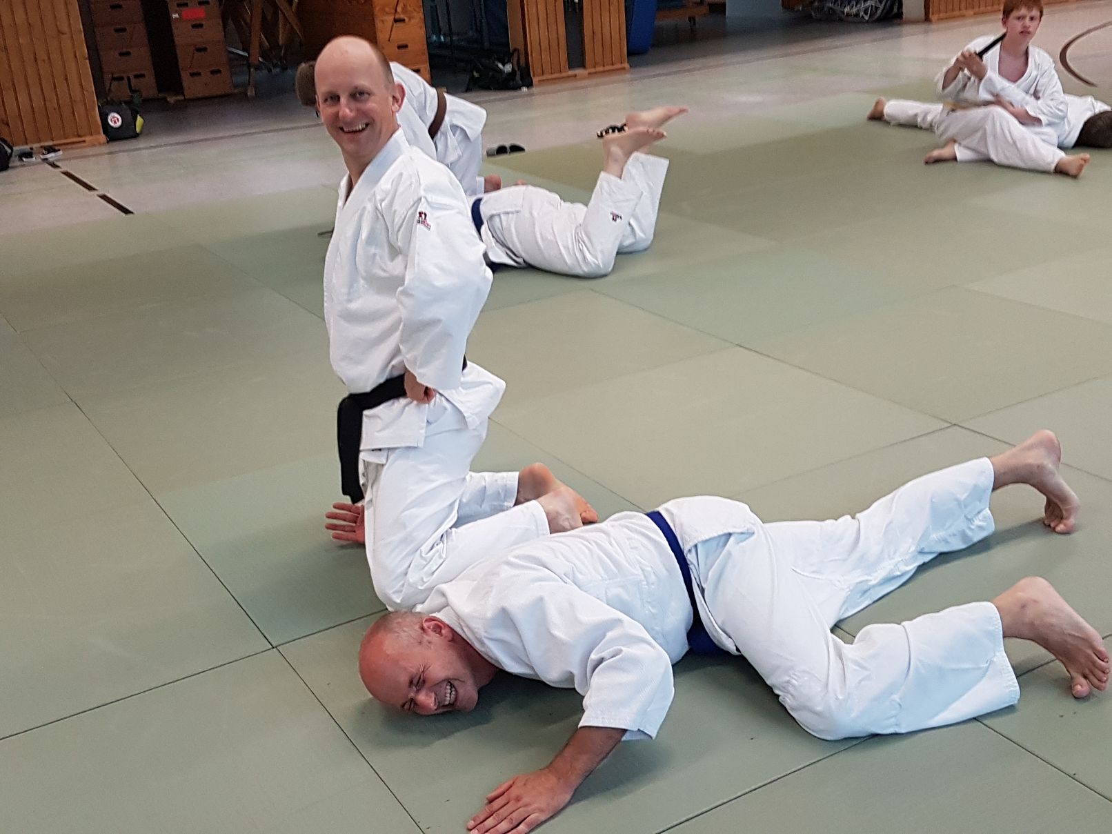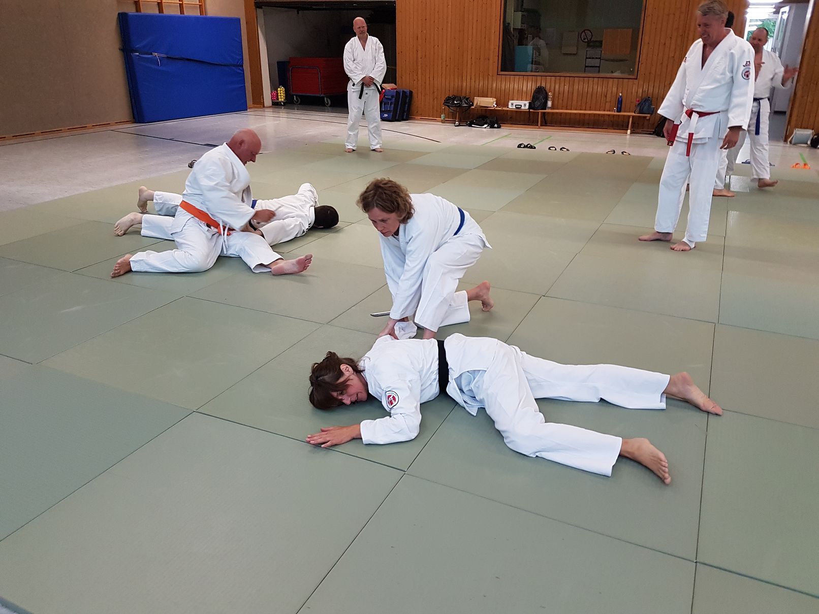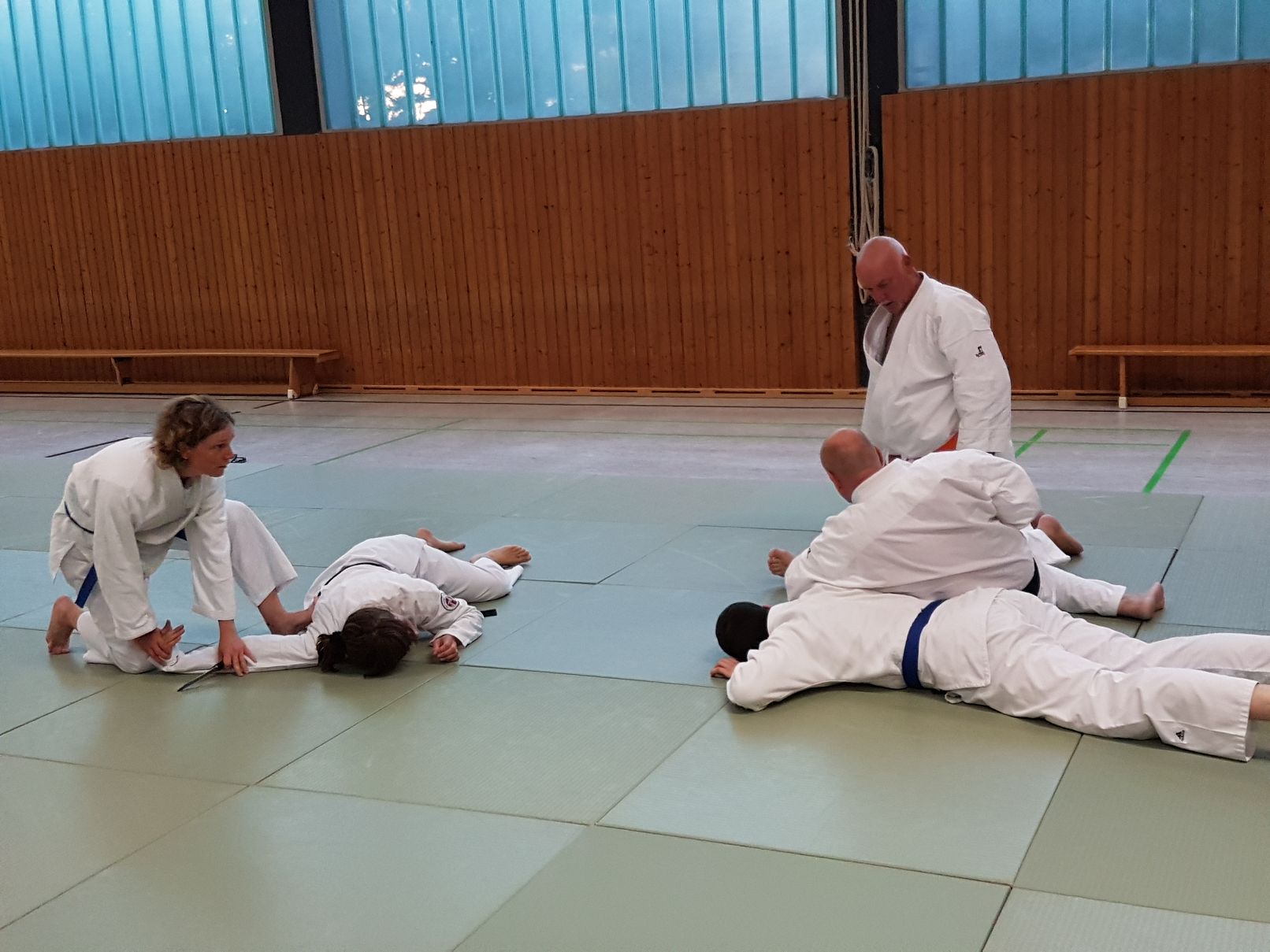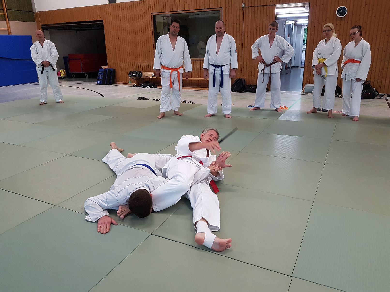 Der Applaus nach dem Training war seiner! Die Begeisterung der Sportler kam von ganzen Herzen. Dieter Gobien, 6. Dan Jiu Jitsu, Prüfungswart der JJU NW, hatte am 29. Juli bei uns ein Gasttraining gegeben. Wie bei vielen Sondertrainingseinheiten, hatten wir die Sportler des Zen-Ki-Budo aus Bochum eingeladen. Diese Vereinsfreundschaft besteht bereits seit längerer Zeit und so trainieren die Nippons und die Zen-Ki-Budos immer mal wieder zusammen. „Habt Ihr einen besonderen Wunsch für das Thema?“ hatte Dieter im Vorfeld gefragt. Spontan war uns „Abwehren von Messerangriffen“ in den Sinn gekommen. Dass dies eine gute Wahl war, merkten wir ganz schnell. Nach einem kurzen Aufwärmtraining mit Jiu Jitsu-Bewegungen und Technikeingängen, legte Dieter los. Es gab eine kurze Theorie über das Messer als Waffe und schon hatte Dieter diese Waffe bedrohend am Hals. Doch schneller als Angreifer Adam schauen konnte, lagen die Dinge völlig anders - nämlich Adam auf dem Boden und das Messer ganz ruhig in Dieters Hand. Dann wurde geübt…