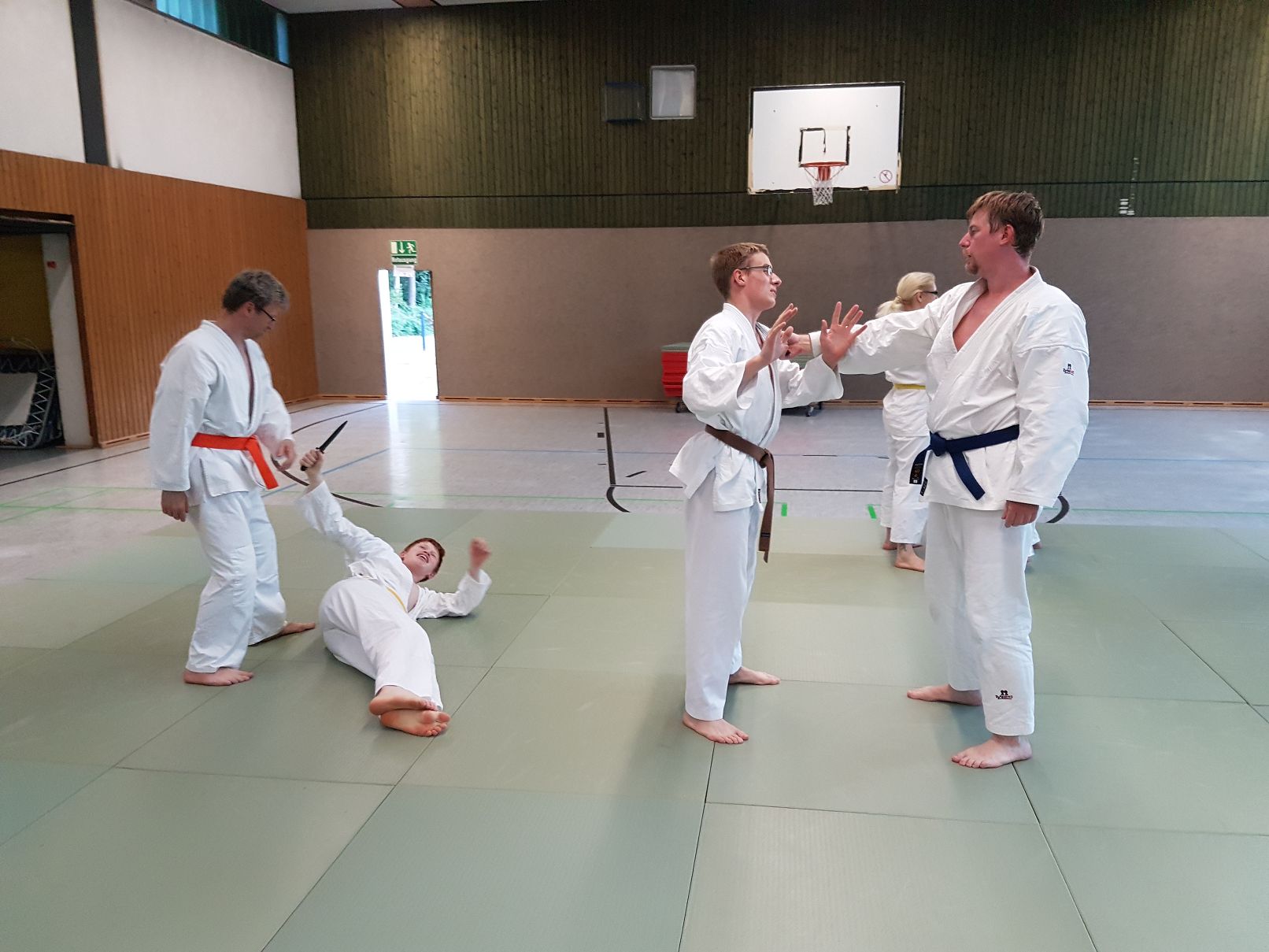 Es folgten Angriffe mit einem Messerstich von vorn, von der Seite und im Boden aus einer Rauferei heraus - Dieter parierte sie alle effektiv und elegant.