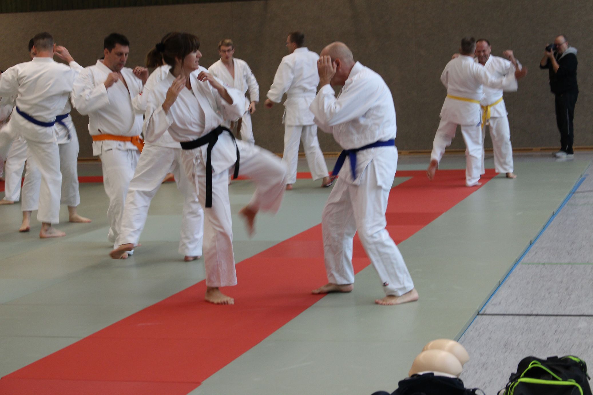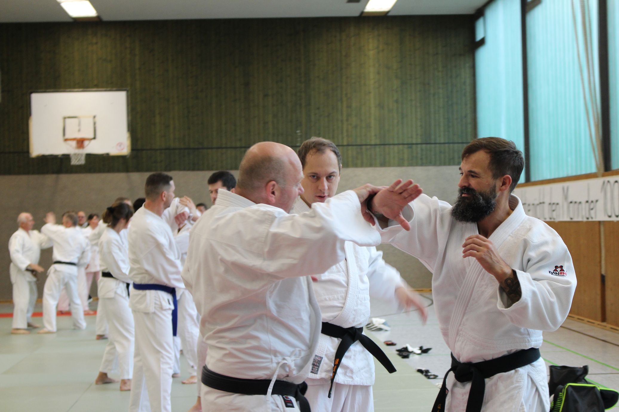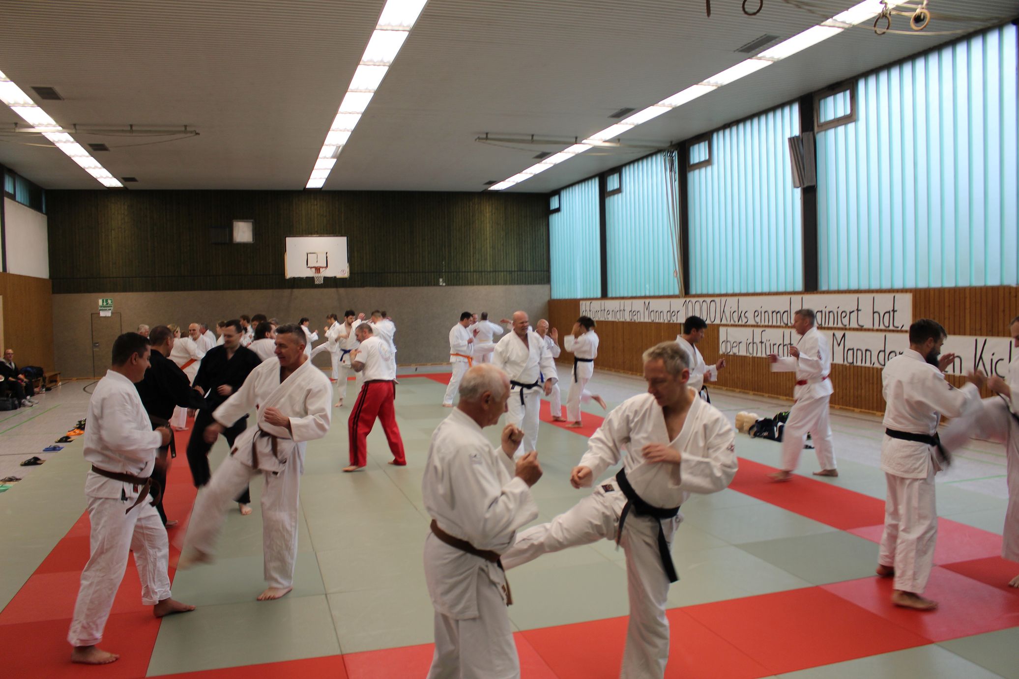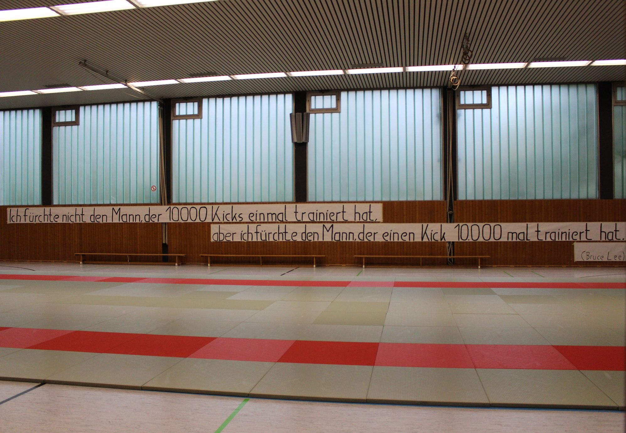 Dieses Zitat von Bruce Lee stand in riesigen Buchstaben an der Wand des Dojo des Nippon, als am 27.10. dort ein Landeslehrgang der JJU NW stattfand. Referent dieses Events war unser Trainer Benedikt, der mit seinem 4. Dan schon zu den höheren Danträgern des Landesverbandes gehört. Vielleicht war es dieser Tatsache geschuldet, dass fast 40 Jiu Jitsuka aus verschiedenen Vereinen nach Velbert gekommen waren, um an jenem Sonntagmorgen dabei zu sein. Vielleicht war es auch das Lehrgangsthema gewesen: „Schlag- und Trittkombinationen in der Selbstverteidigung“. Oder vielleicht wussten auch schon einige aus der Vergangenheit, dass bei Benedikt und seinem Trainingspartner Adam ein lehrreicher aber auch kurzweiliger Vormittag zu erwarten war. Wahrscheinlich war es eine Mischung aus allem dreien.