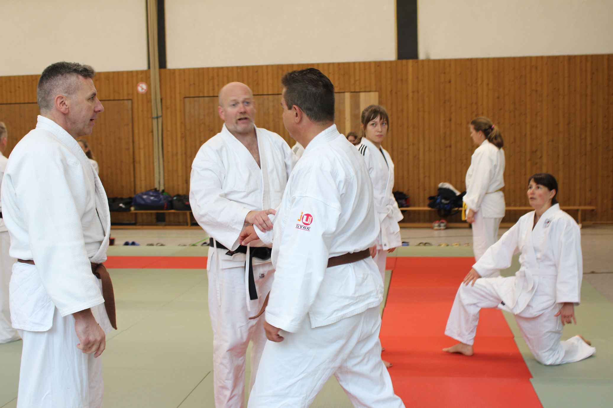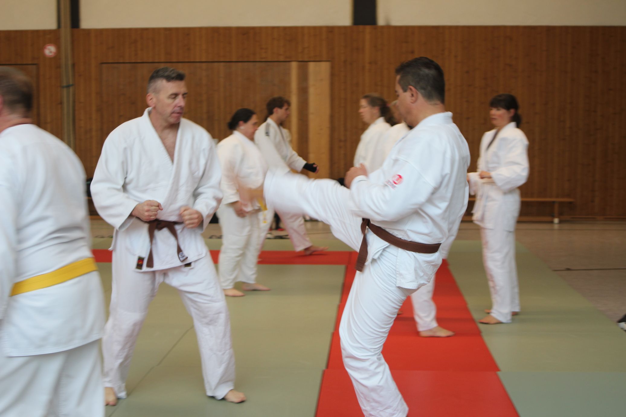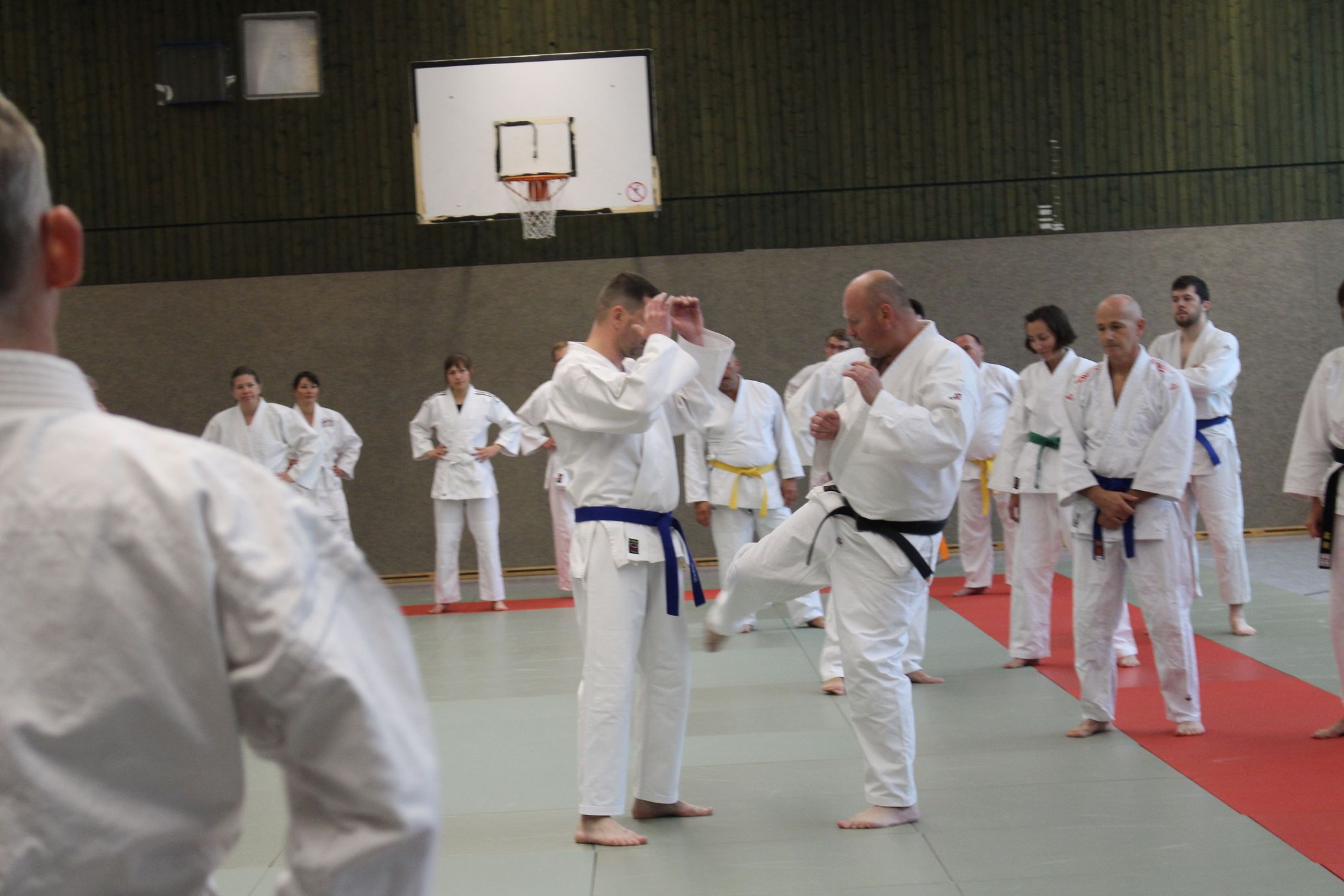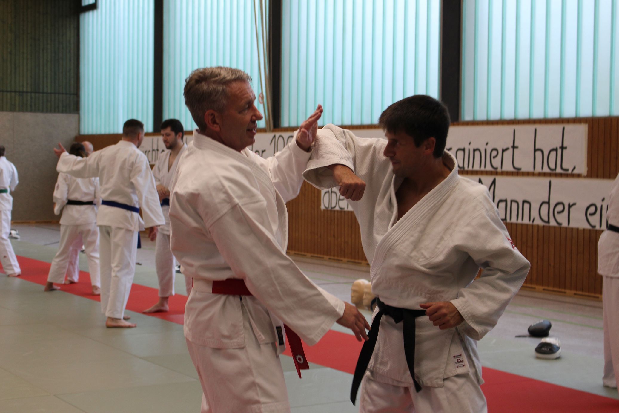 Dieses Zitat von Bruce Lee stand in riesigen Buchstaben an der Wand des Dojo des Nippon, als am 27.10. dort ein Landeslehrgang der JJU NW stattfand. Referent dieses Events war unser Trainer Benedikt, der mit seinem 4. Dan schon zu den höheren Danträgern des Landesverbandes gehört. Vielleicht war es dieser Tatsache geschuldet, dass fast 40 Jiu Jitsuka aus verschiedenen Vereinen nach Velbert gekommen waren, um an jenem Sonntagmorgen dabei zu sein. Vielleicht war es auch das Lehrgangsthema gewesen: „Schlag- und Trittkombinationen in der Selbstverteidigung“. Oder vielleicht wussten auch schon einige aus der Vergangenheit, dass bei Benedikt und seinem Trainingspartner Adam ein lehrreicher aber auch kurzweiliger Vormittag zu erwarten war. Wahrscheinlich war es eine Mischung aus allem dreien.