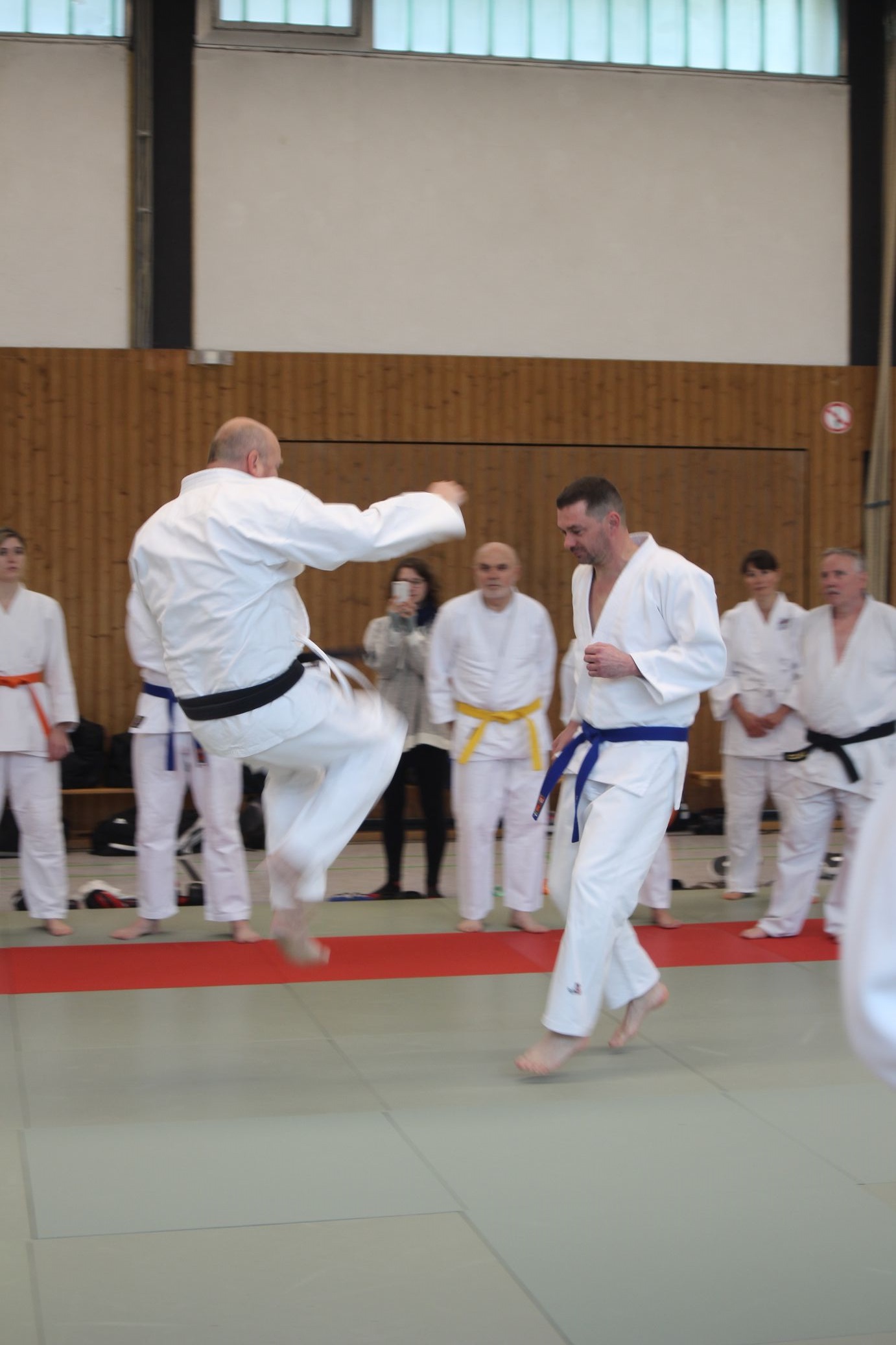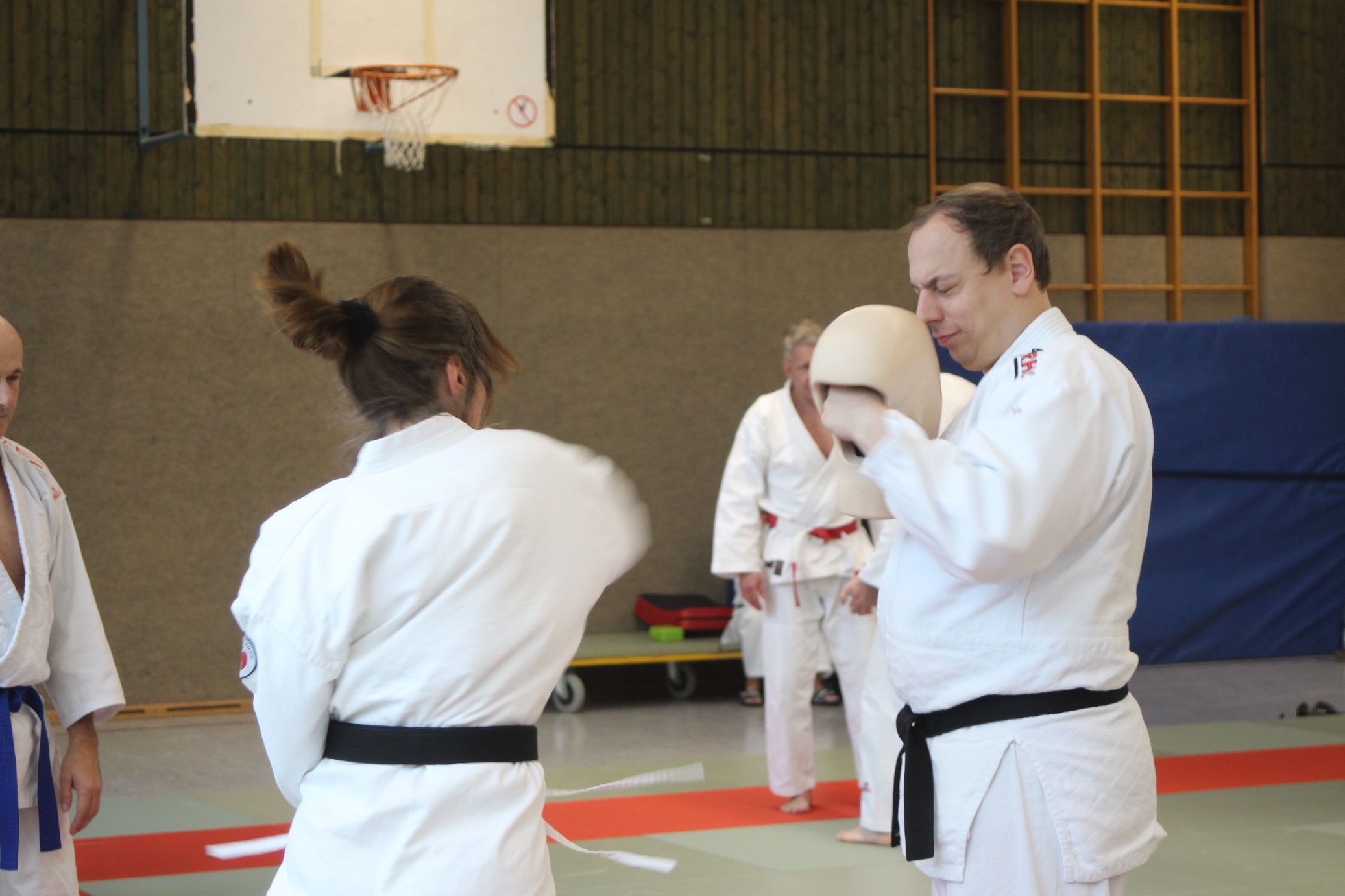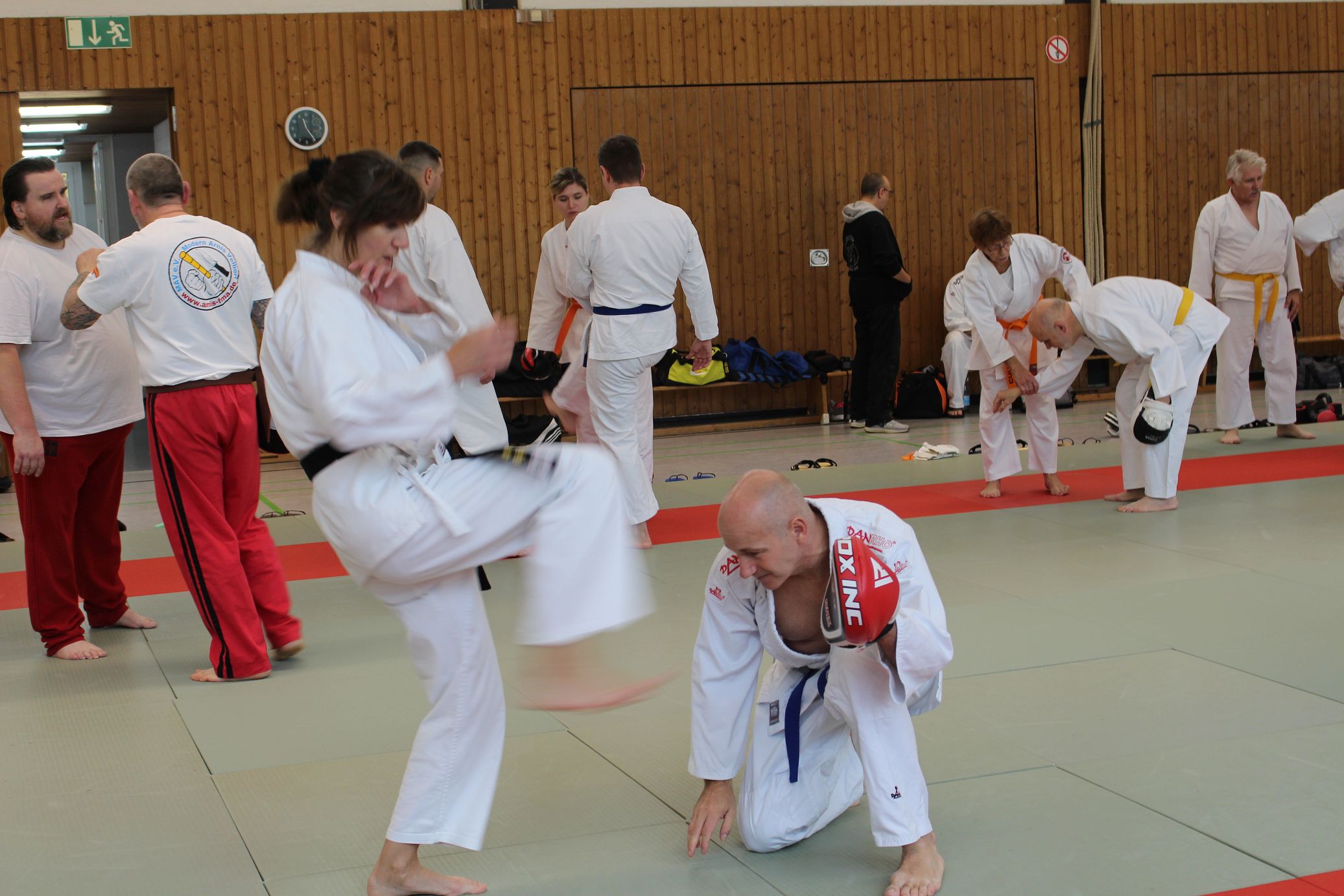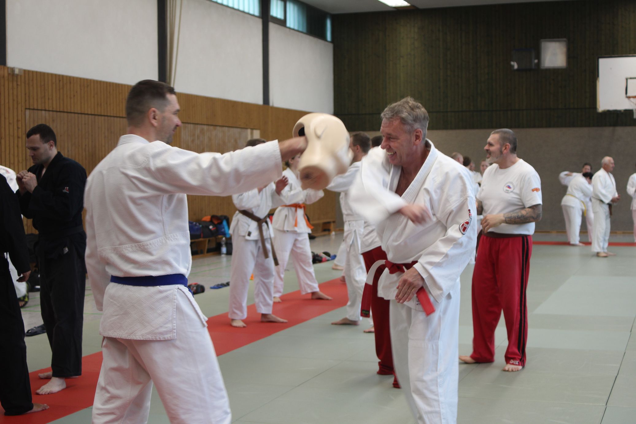Benedikt zeigte auch den Einsatz von Handpratzen zum Training von Tritt-, Schlag- und Blocktechniken. Für einige Sportler gab es hierbei teils ungewohnte Möglichkeiten, mit einer Handpratze zu arbeiten. „Da gilt dasselbe, wie für die Schlag- und Tritttechniken an sich, “ erklärte der Referent, „hier hilft nur üben, üben und nochmals üben…“