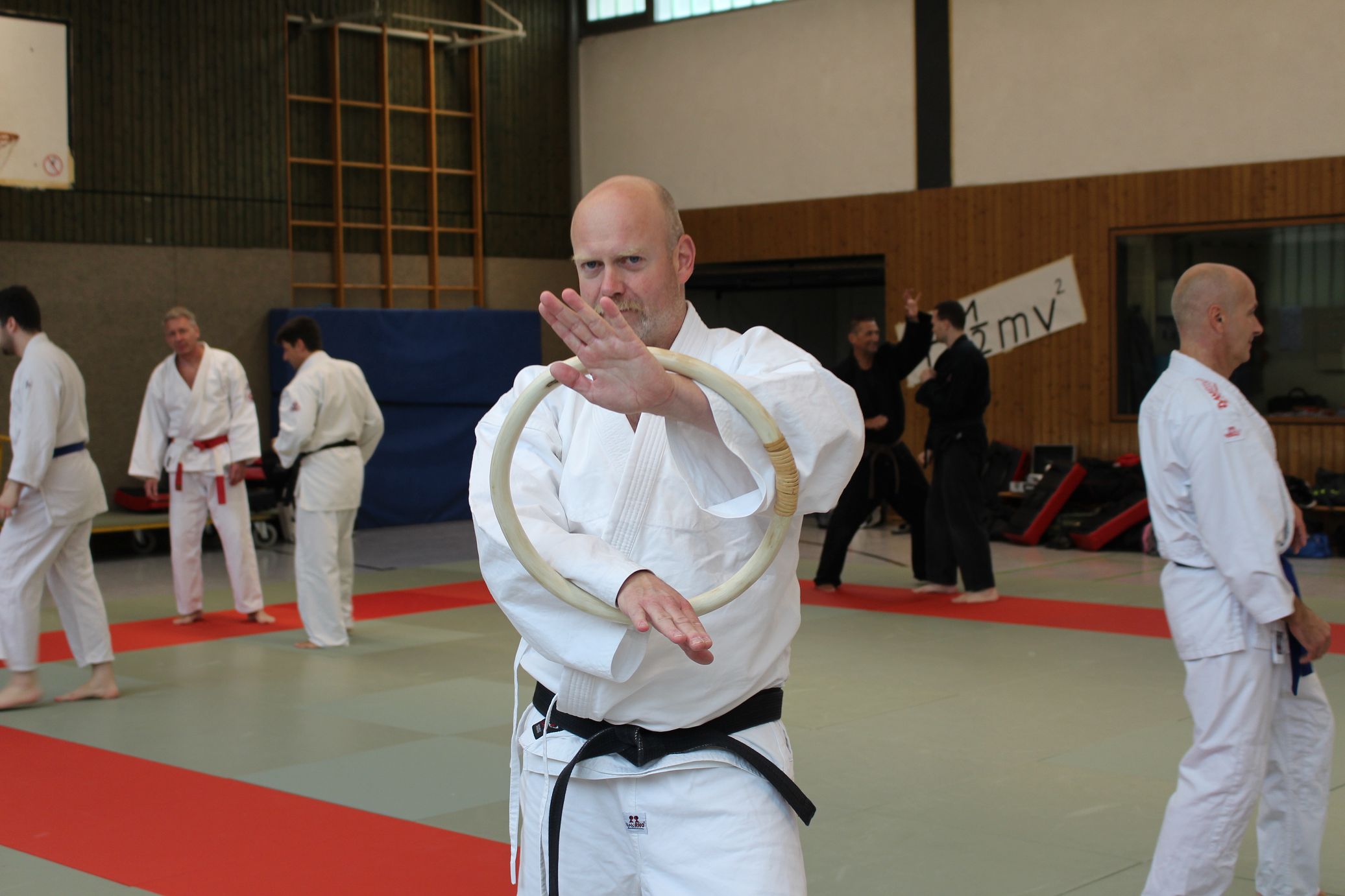 Seinen Blick über den Jiu Jitsu-Tellerrand stellte Benedikt unter Beweis, als er ein sehr traditionelles Trainingsgerät aus China vorstellte. Das Training mit dem Bambusring kann auch Jiu Jitsukas helfen, schnelle Block- und Schlagtechniken zu erlernen.