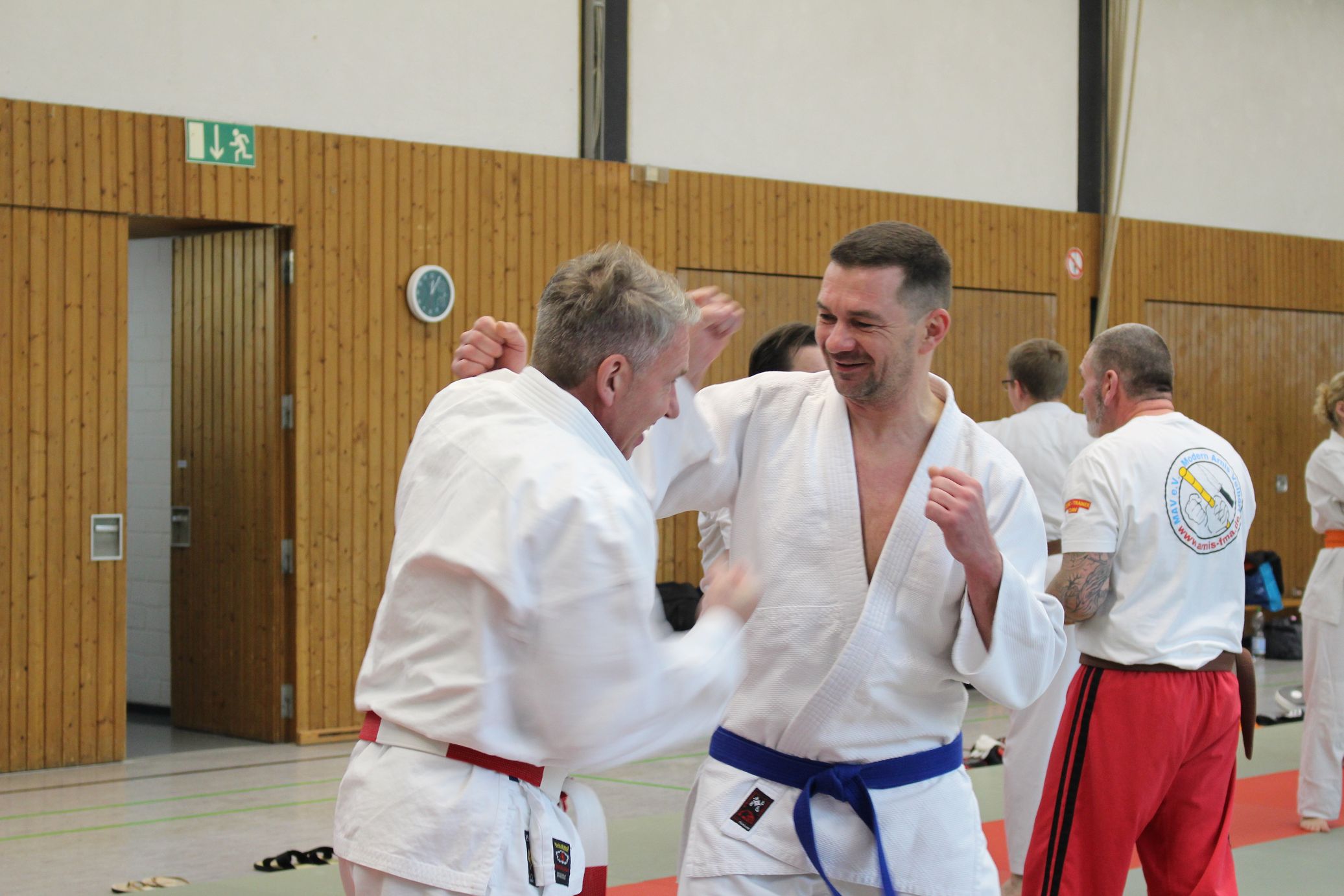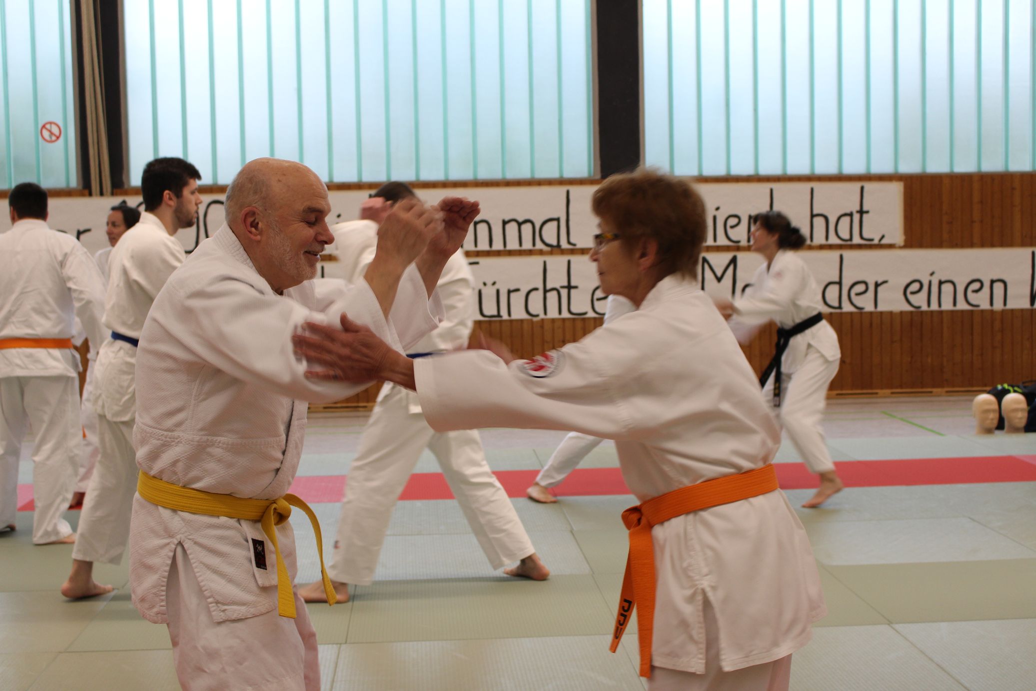 Nach einer kurzen Vorstellung ging es dann auch um kurz nach zehn gleich zackig los. Zuerst ein paar lockere Bewegungen zum ersten Warmwerden, dann folgten gleich zwei Drills zum Einsatz der Ellenbogen und Unterarmknochen als Schlagwaffe. „Das erste koordinativ anspruchsvolle Schmankerl,“ hatte Benedikt es genannt, und das war es auch. Ellenbogenschläge machen, stoppen, umleiten, Blockbarrieren aus dem Weg räumen und fliegender Angreiferwechsel - und das sonntags morgens, kurz nach zehn. Danach waren wirklich alle wach.