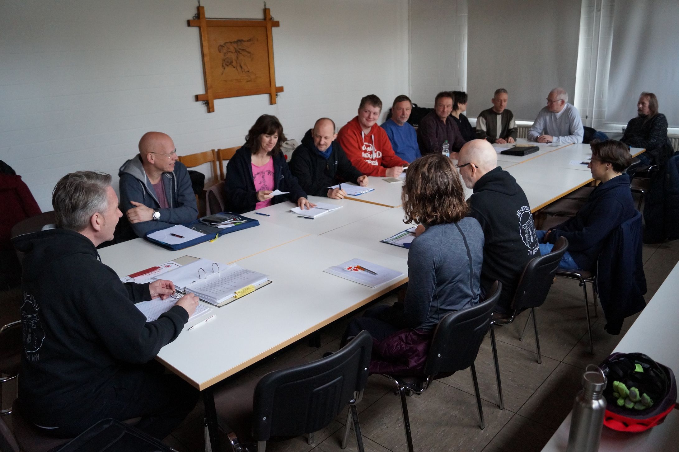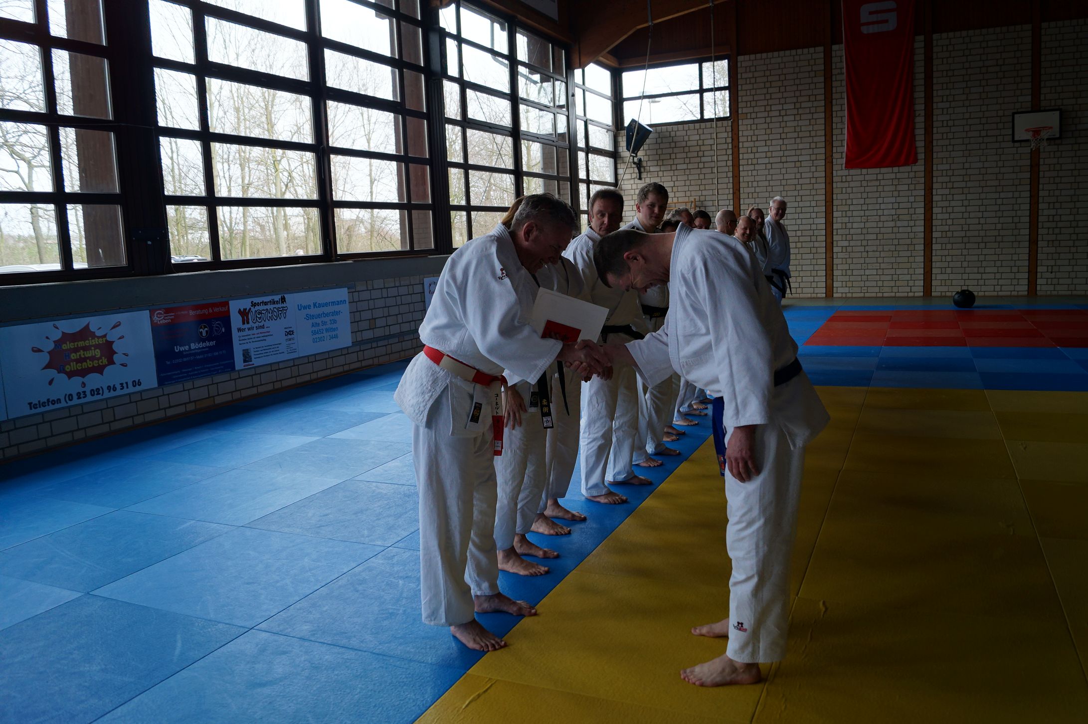 Die 15 Prüfer am Mattenrand verfolgten jeden Schritt und Griff ganz genau, machten sich Notizen, schrieben Noten. Da auch die Kondition von Prüfling und Partner in die Beurteilung miteinfließt, zeigten Adam und Benedikt gleich, dass sie gut vorbereitet waren und legten mit einem zügigen Tempo los, das sie bis zum Ende der Prüfung beibehielten. Dann kam für die beiden endlich die letzte Technik, im Anschluss das Abgrüßen - und das Warten, denn Dieter Gobien nahm „seine“ Prüfer mit in den Besprechungsraum. Denn schließlich galt es an diesem Tag, etwas über das Benoten zu lernen.