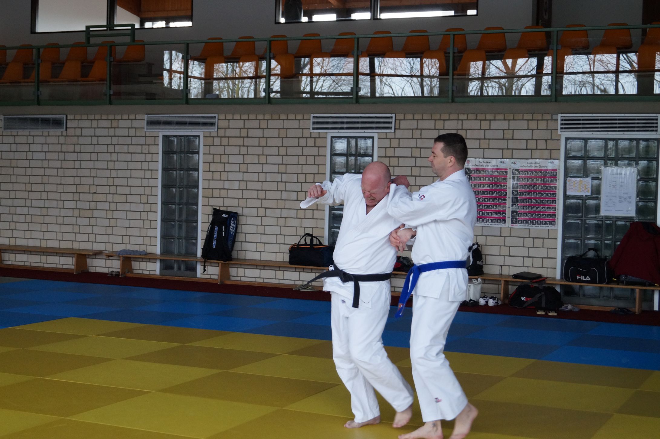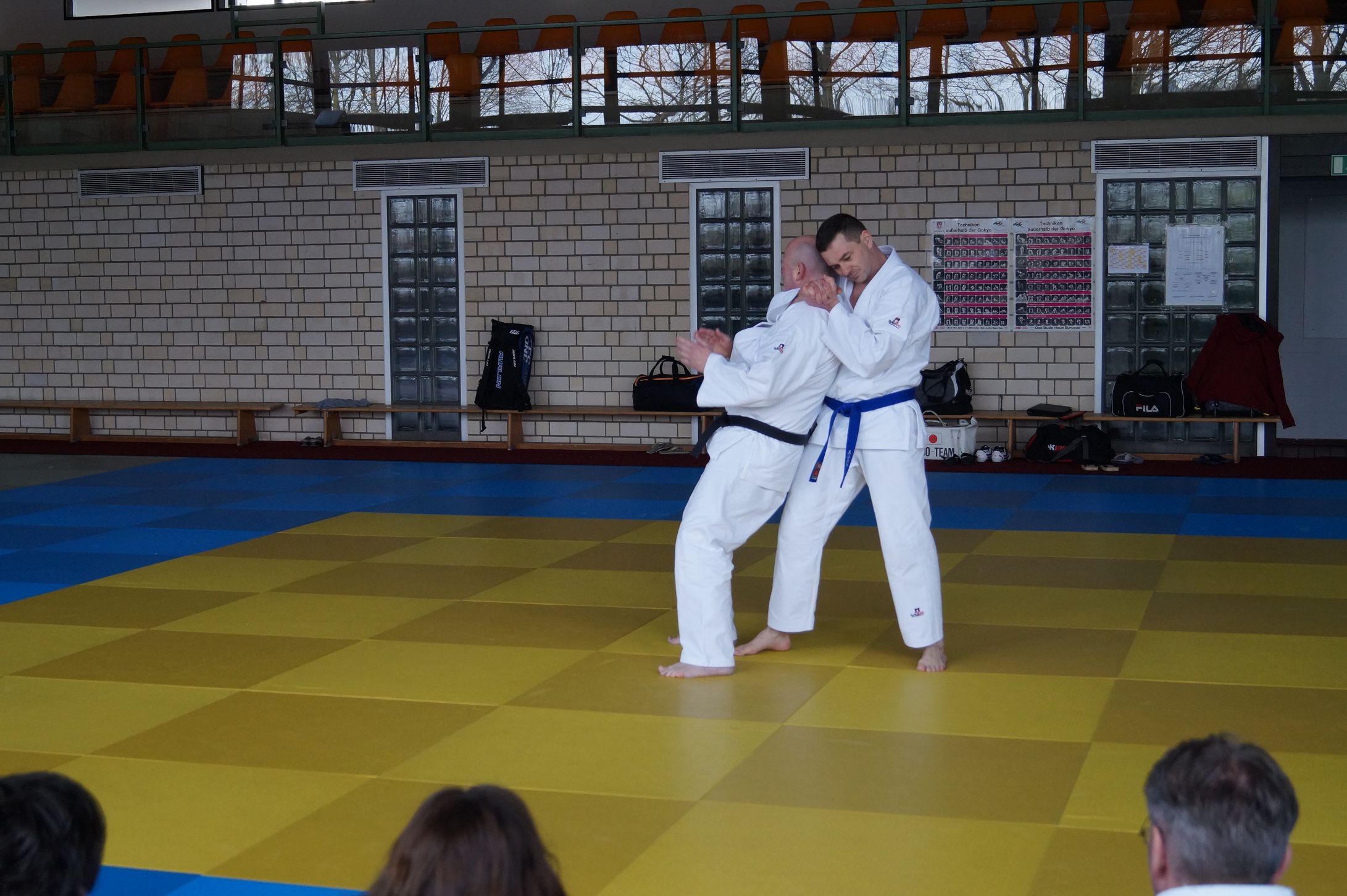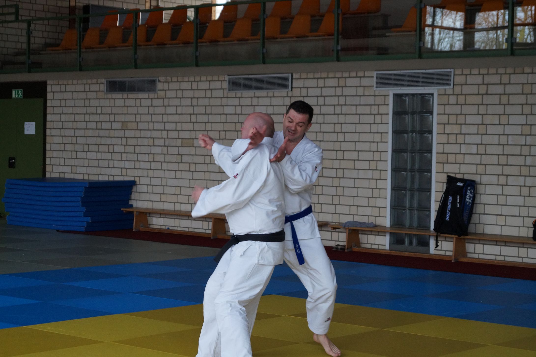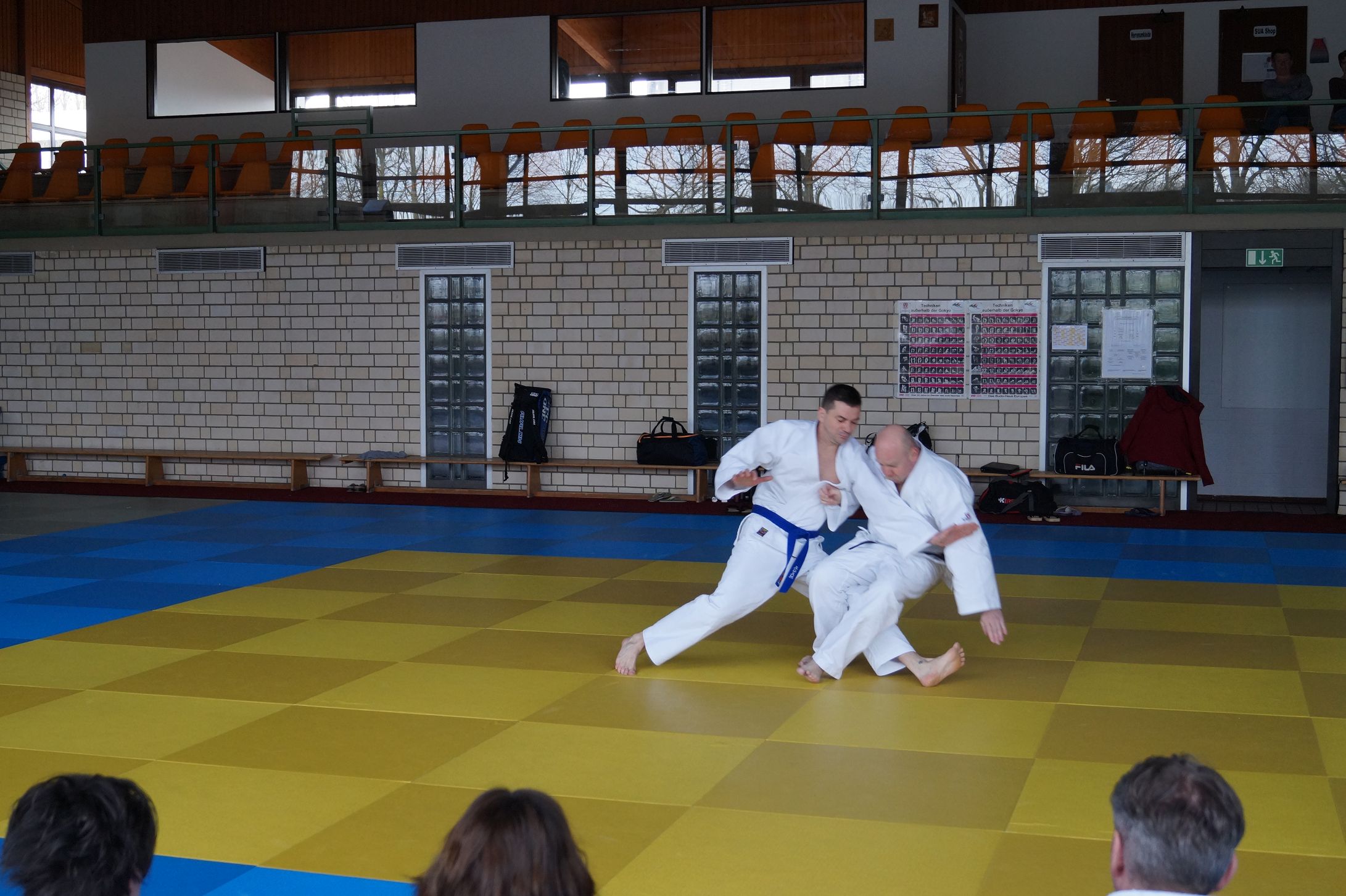 Die ideale Möglichkeit auf Schulungen diese Situation zur Schau stellen zu können, ist ein echter Prüfling, mit echter Prüfung und echtem Lampenfieber. Am 8. März konnte Dieter Gobien seinen Prüfern einen Kandidaten für eine echte Braungurtprüfung präsentieren. Adam Jacko, einer unserer Jugendtrainer, stellte sich dieser Aufgabe. Zusammen mit seinem Partner Benedikt Meinhardt, Trainer in unserer Erwachsenengruppe, trat er an.