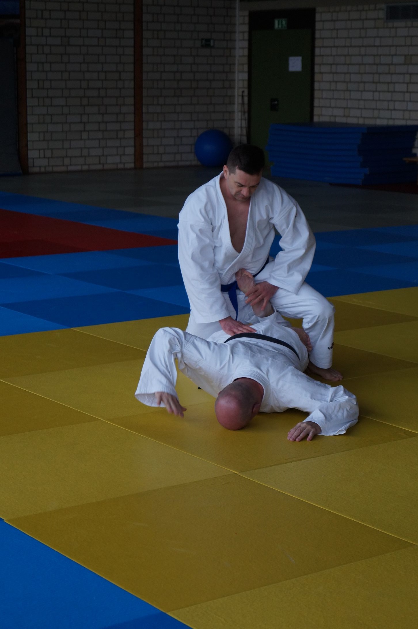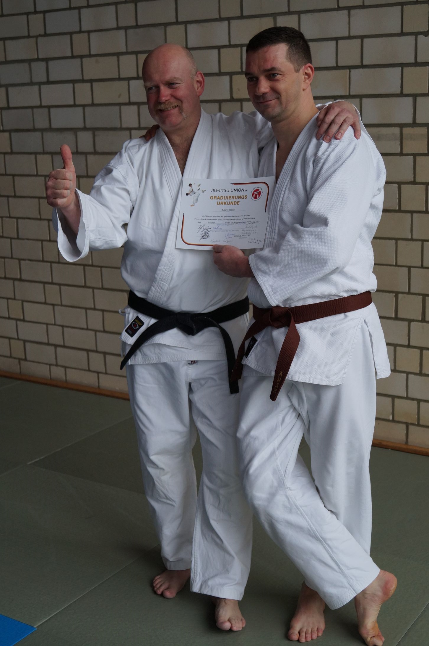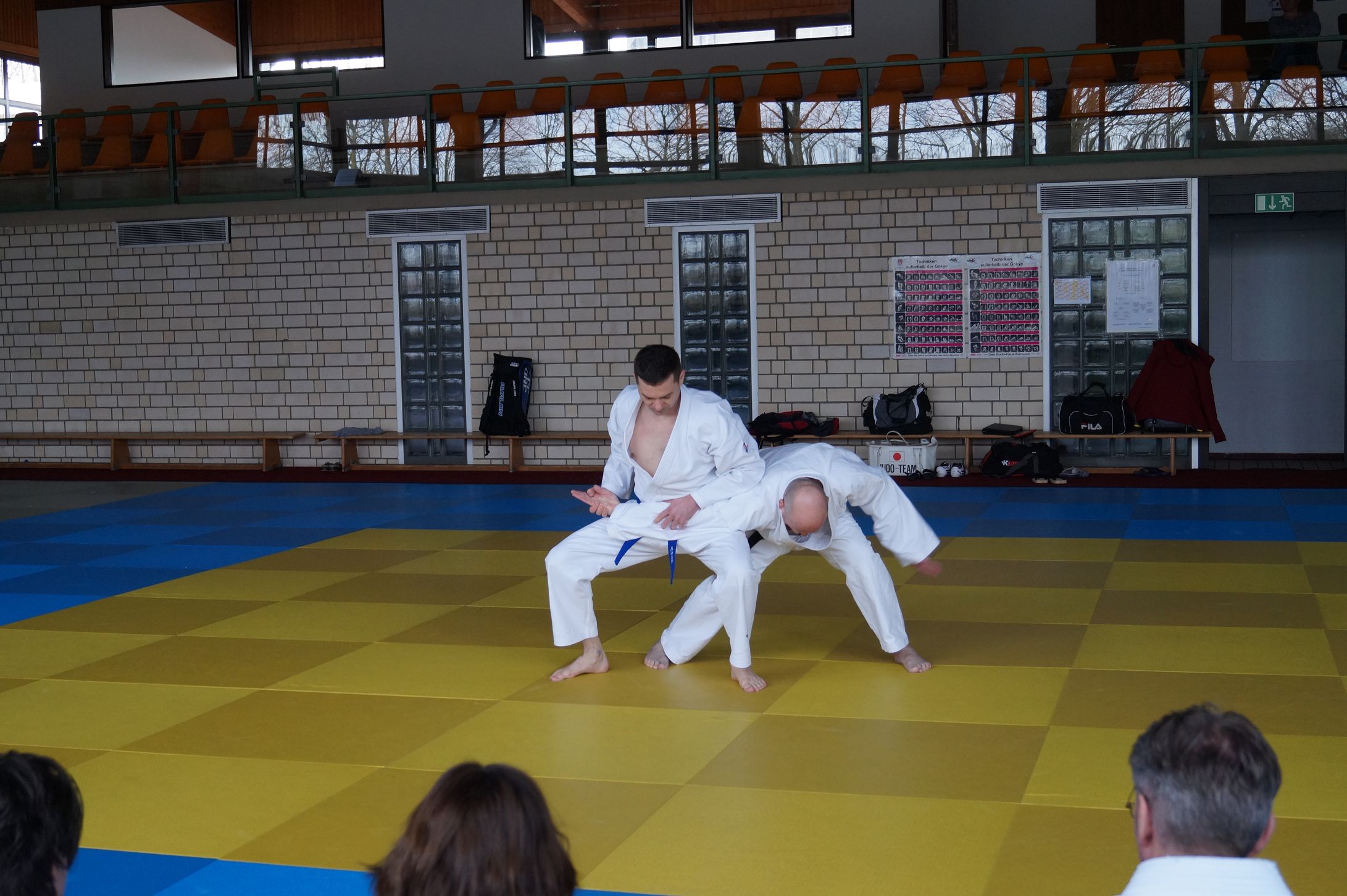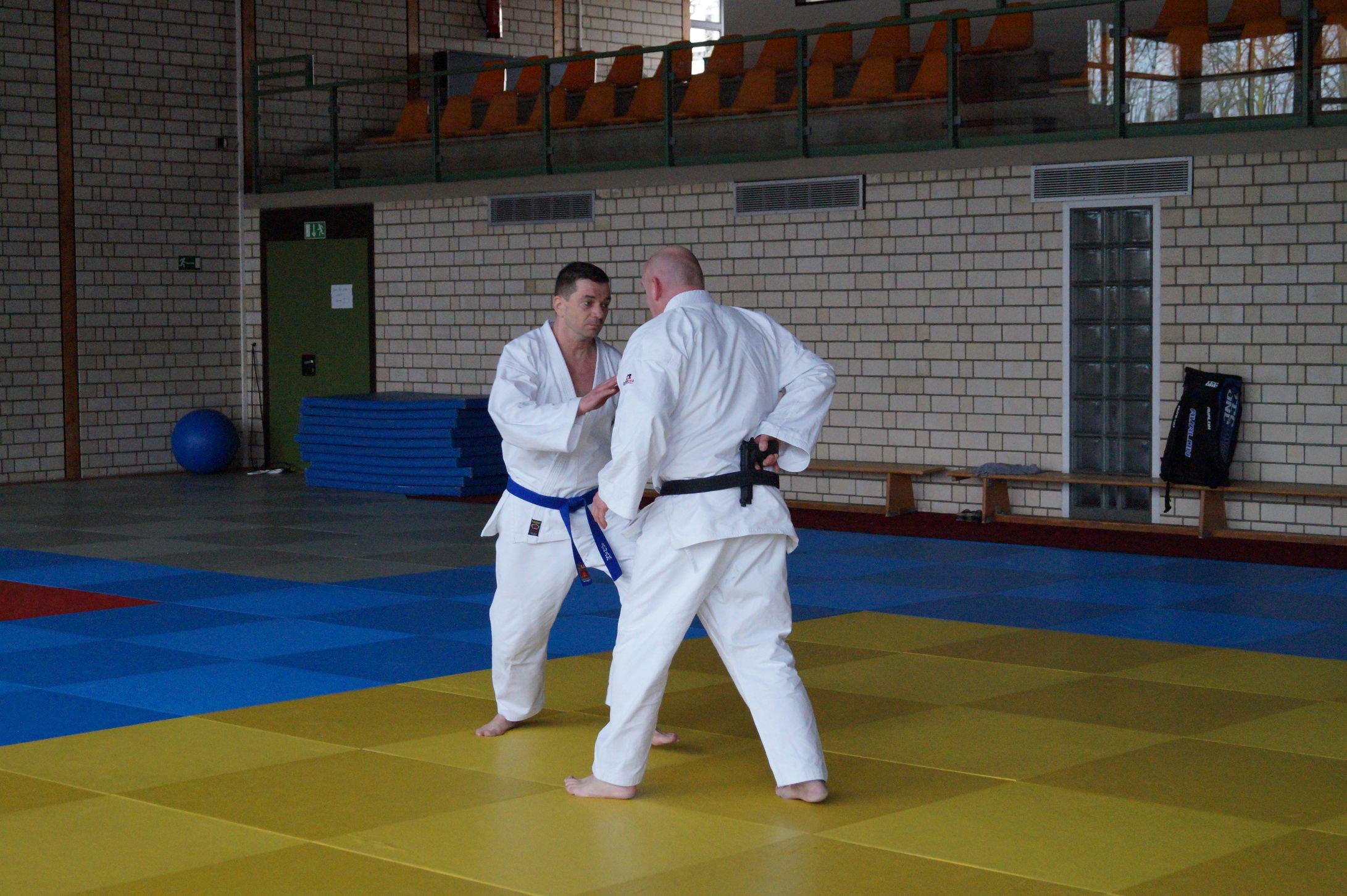 Die ideale Möglichkeit auf Schulungen diese Situation zur Schau stellen zu können, ist ein echter Prüfling, mit echter Prüfung und echtem Lampenfieber. Am 8. März konnte Dieter Gobien seinen Prüfern einen Kandidaten für eine echte Braungurtprüfung präsentieren. Adam Jacko, einer unserer Jugendtrainer, stellte sich dieser Aufgabe. Zusammen mit seinem Partner Benedikt Meinhardt, Trainer in unserer Erwachsenengruppe, trat er an.