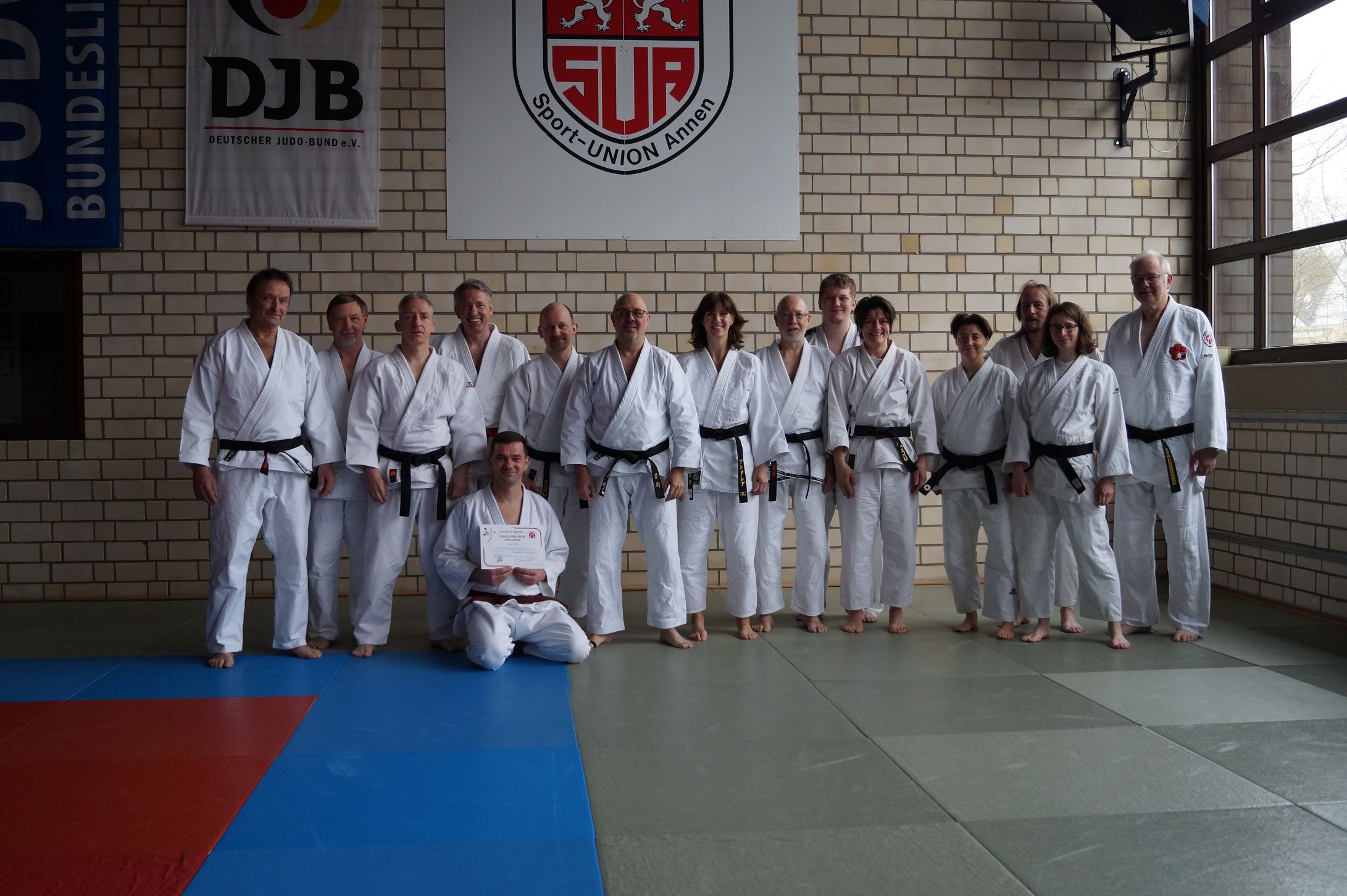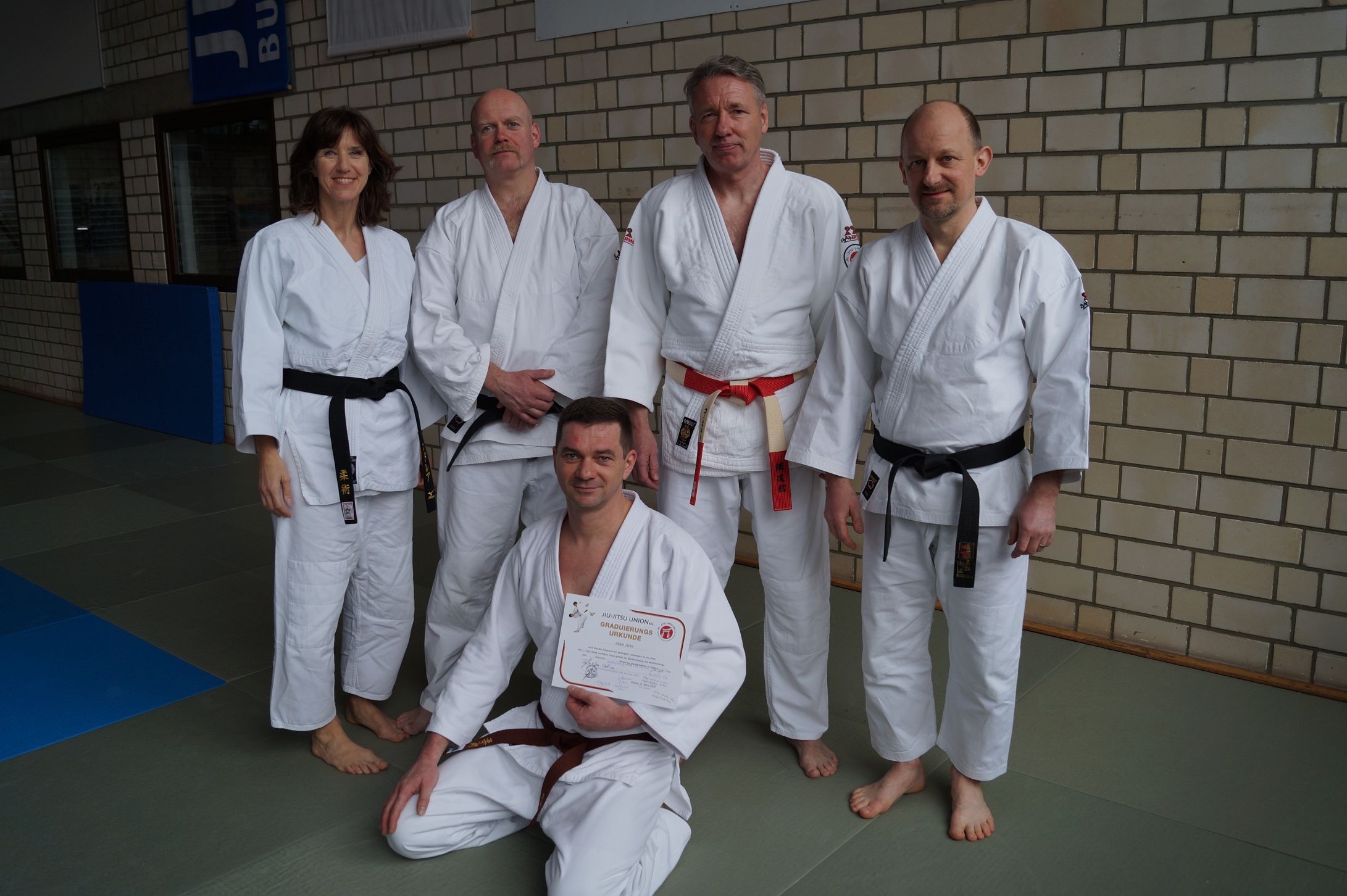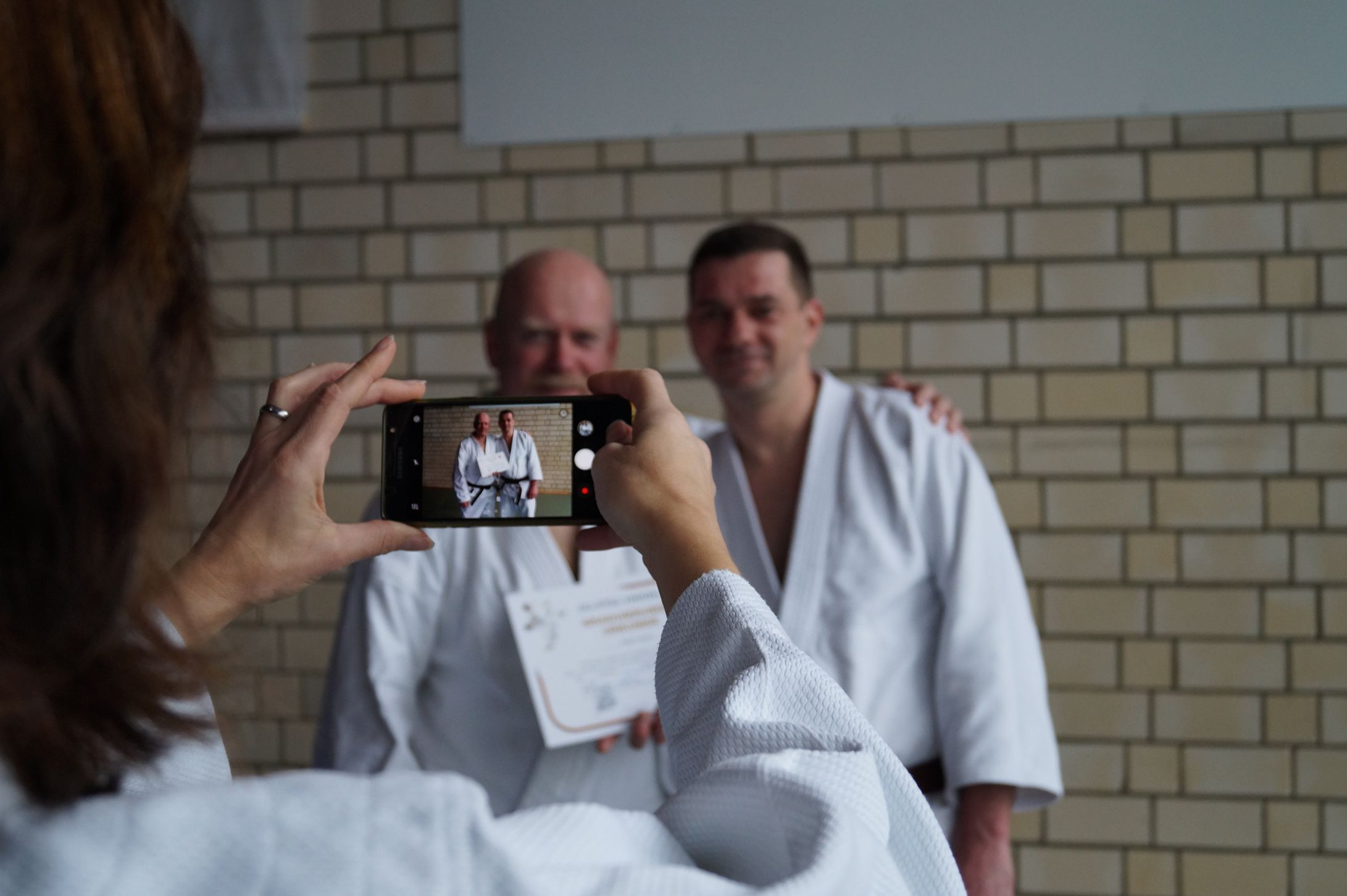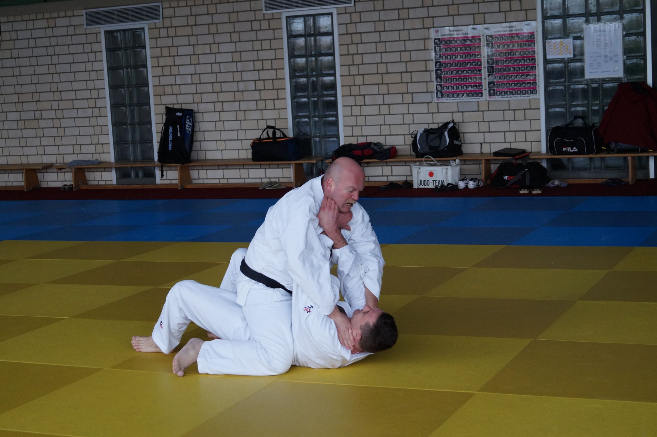 Die ideale Möglichkeit auf Schulungen diese Situation zur Schau stellen zu können, ist ein echter Prüfling, mit echter Prüfung und echtem Lampenfieber. Am 8. März konnte Dieter Gobien seinen Prüfern einen Kandidaten für eine echte Braungurtprüfung präsentieren. Adam Jacko, einer unserer Jugendtrainer, stellte sich dieser Aufgabe. Zusammen mit seinem Partner Benedikt Meinhardt, Trainer in unserer Erwachsenengruppe, trat er an.