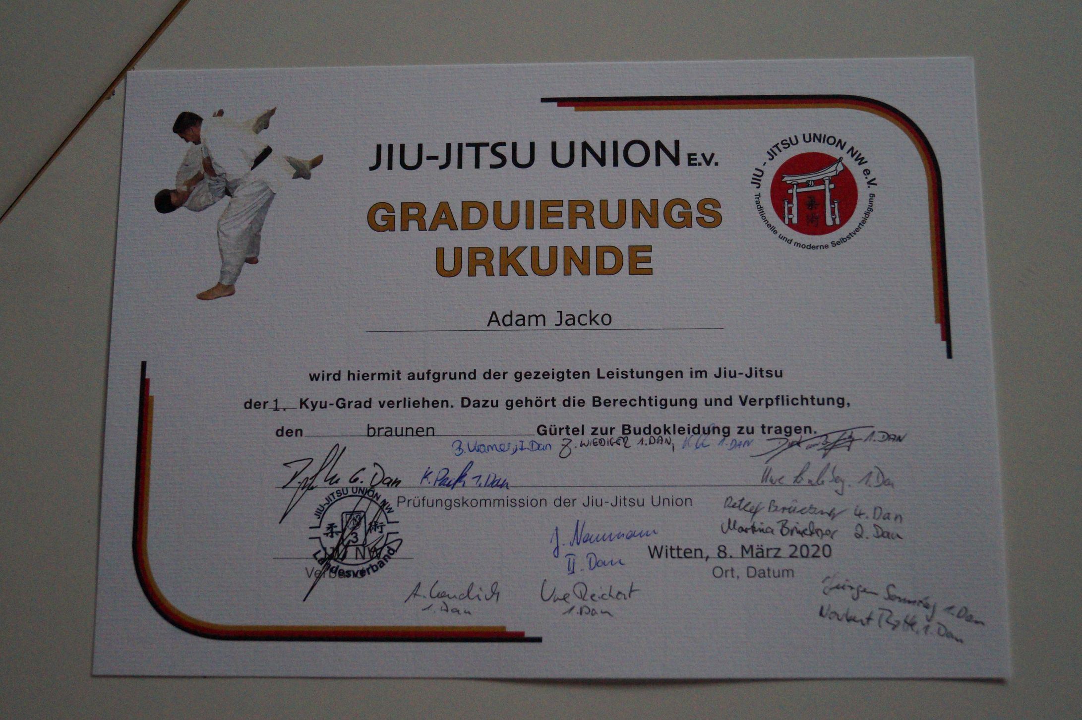 Wir gratulieren Adam Jacko zu seinem redlich erkämpften 1. Kyu Jiu Jitsu.