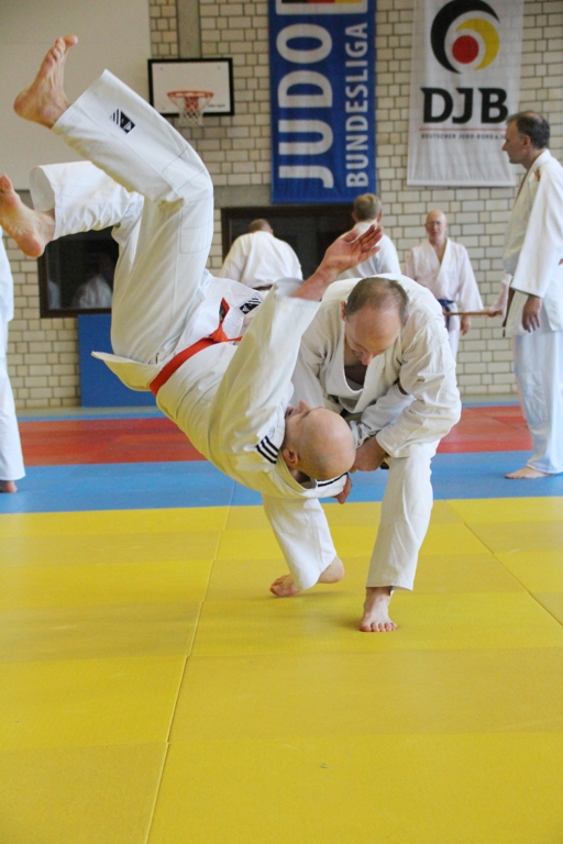 Als Schüler der Kimeno Kata sind unsere Sportskollegen Jörg und Bernd nach Witten gereist. Und da hieß es nach einem kurzen Theorieteil und einem knappen Aufwärmtraining: „Runter auf die Knie - die erste Technikgruppe wird komplett im Kniestand gezeigt.“ Und so mussten die Übenden drei Stunden aus dem Knien schlagen und treten, hebeln, werfen und würgen. Selbst Waffentechniken beinhaltet diese Form als Bodentechnik. Die letzten drei Techniken der ersten Gruppe sind Verteidigung gegen den Dolch.