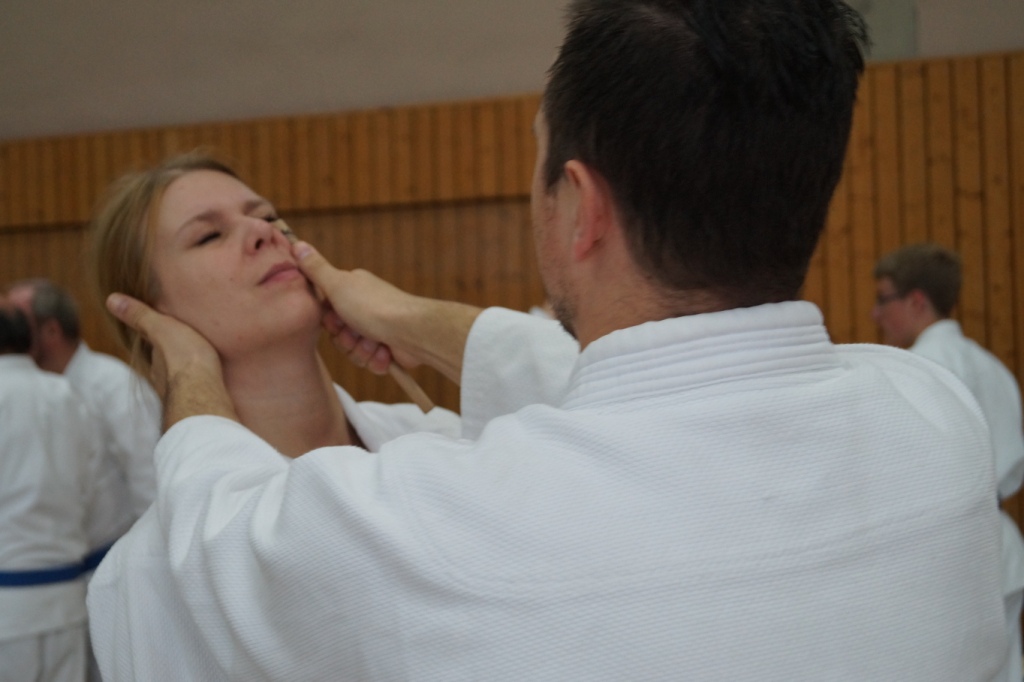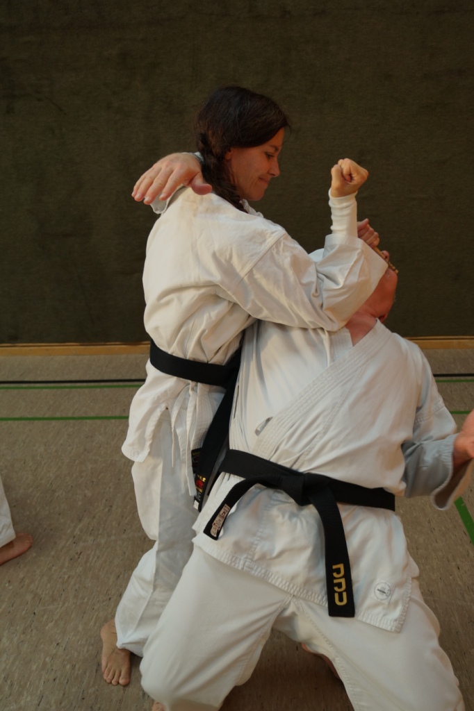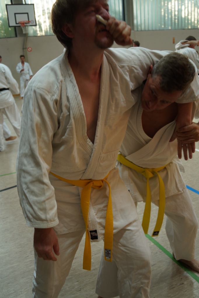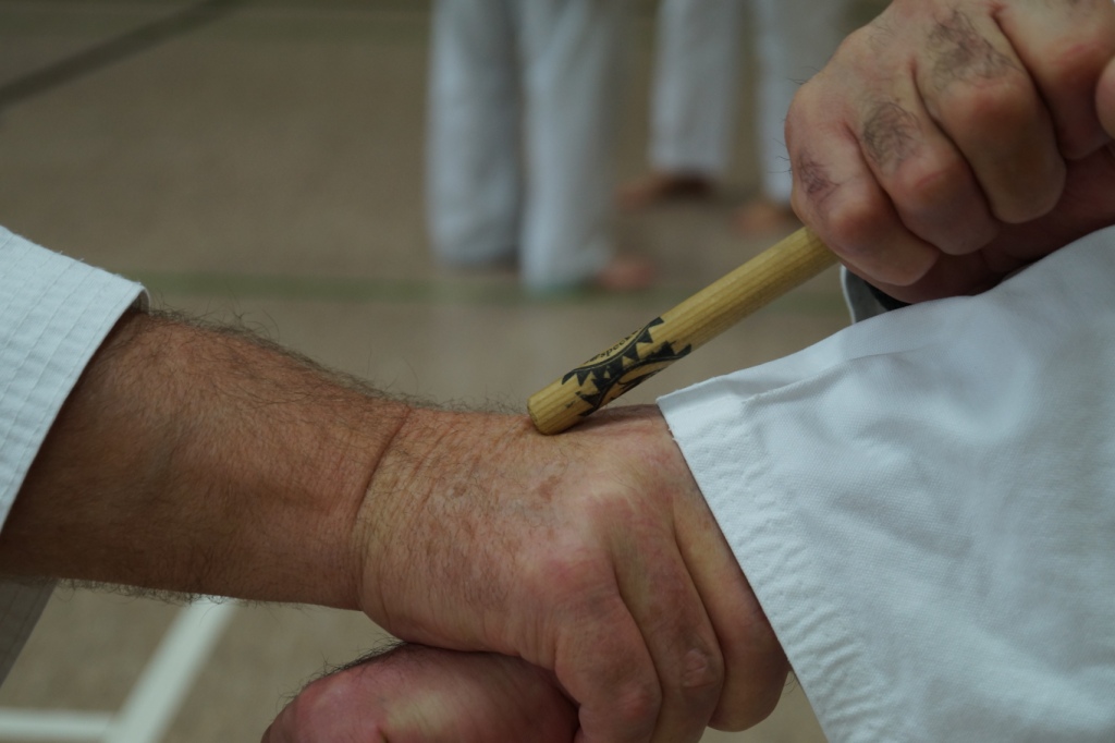 Hand-Arm fassen, Revers fassen, würgen von hinten, von der Seite, alle Abwehrtechniken endeten mit präzise angesetztem Kubotan. Der Druck auf die richtige Stelle machte Würfe überflüssig. Tine und ich (Ursula) trainierten begeistert mit. Mit Vorsicht testeten wir die wichtigen Druckpunkte und waren fasziniert von der Wirkung. Michel und Markus hatten ein wachsames Auge auf das ganze Geschehen und halfen wo immer es nötig war.