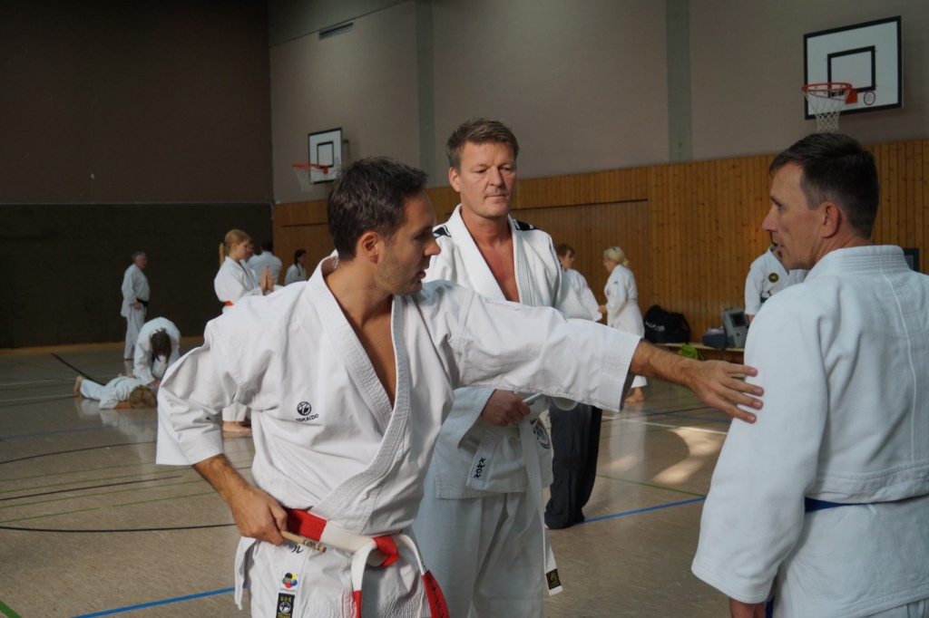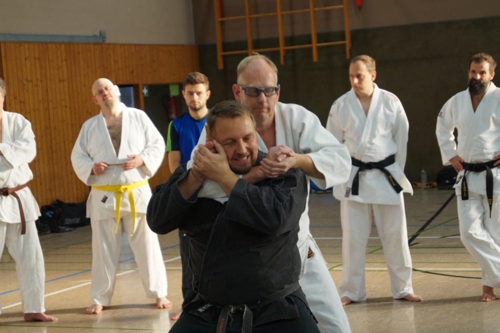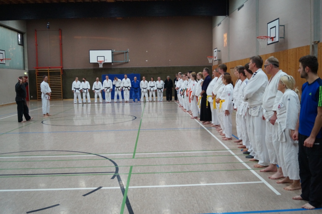 Die Referenten - Michel Andre, 6.Dan Jiu Jitsu und Markus Speckamp, 3.Dan Jiu Jitsu - begrüßten trotz des sonnigen Herbstwetters eine erstaunlich große Anzahl wissbegieriger Sportler. Auch der Nippon Velbert war natürlich präsent.