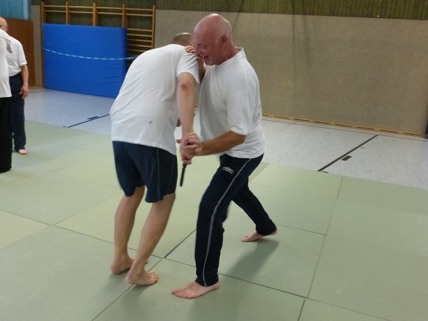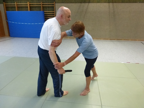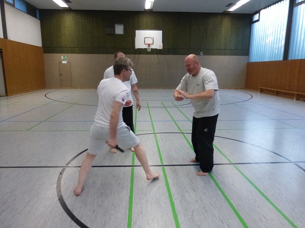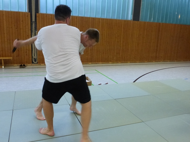 Dann folgten die ersten Techniken mit den Farb-Messern. Aufgabe des Angreifers waren wilde, scheinbar unkontrollierte Stiche und Schnitte zum Bauch und zu den Armen. Hier galt es, den Messerarm zu blocken - einfach nur nicht getroffen werden. Der erste Stich kam - alles chic - aber schnell folgten ein zweiter, dritter, vierter… und schon hatten die ersten Sportler drei Striche auf dem Shirt. So ging´s also nicht. Die Verteidiger mussten sich schneller und vor allem lockerer bewegen. Die Treffer wurden weniger. Ziel bei dieser Übung war nicht, den Angreifer zu überwältigen, sondern nicht getroffen zu werden um dann möglichst schnell abhauen zu können. „Das“, betonten die Trainer, „ist überhaupt das Wichtigste! Nicht getroffen werden - nicht den Helden spielen - keine Verletzungen!! Wie bei allen Bedrohungen mit einer Waffe gilt auch beim Messer, sich Risiko und Nutzen im Vorfeld klar zu machen. Ein Handy kann man ersetzen, wenn es Dir abgepresst wird - eine Verstümmelung durch ein Messer bleibt!“ Und so galt es dann auch bei den weiteren Techniken, keine hollywoodtauglichen Stunts zu trainieren, sondern zu üben, Verletzungen zu vermeiden und sich lediglich - aber möglichst effektiv - den Fluchtweg freizukämpfen.
