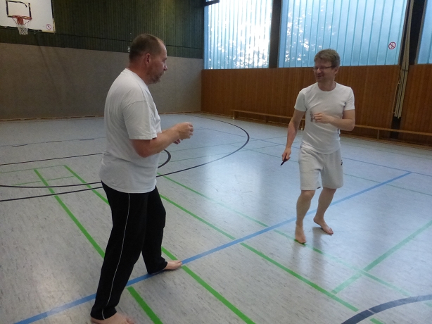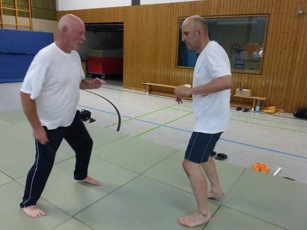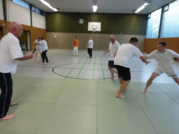 Hier kam damit auch schon die erste Bergetappe des Abends. Bis zu sieben Bewegungen - Stiche, Schnitte, Ausweichen und Blocken - galt es mit dem Partner in einer festen Reihenfolge zu beherrschen, wobei mit der letzten Technik auch noch Angreifer und Verteidiger die Rollen wechselten. Dass es bei einer Hallentemperatur von weit über 25°C schwer fällt sich zu bewegen oder sich zu konzentrieren, ist wohl leicht verständlich. Beides zusammen stellte sich dann als wahre Herausforderung dar.